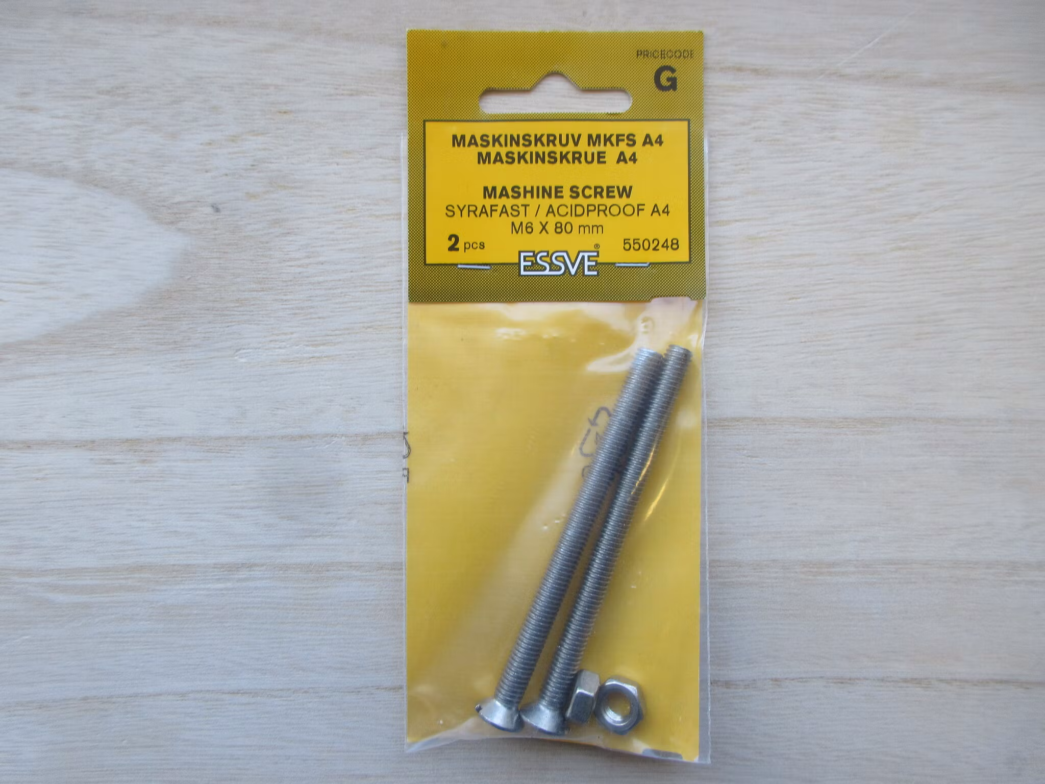 ESSVE Maskinskruv MKFS A4 Syrafast M6x80 mm. 2 st.Kullerförsäkt maskinskruv med mutter och syrafast A4 ytbehandling.Antal 2 st. Maskinskruv. Samt 2 st mutter.Ar