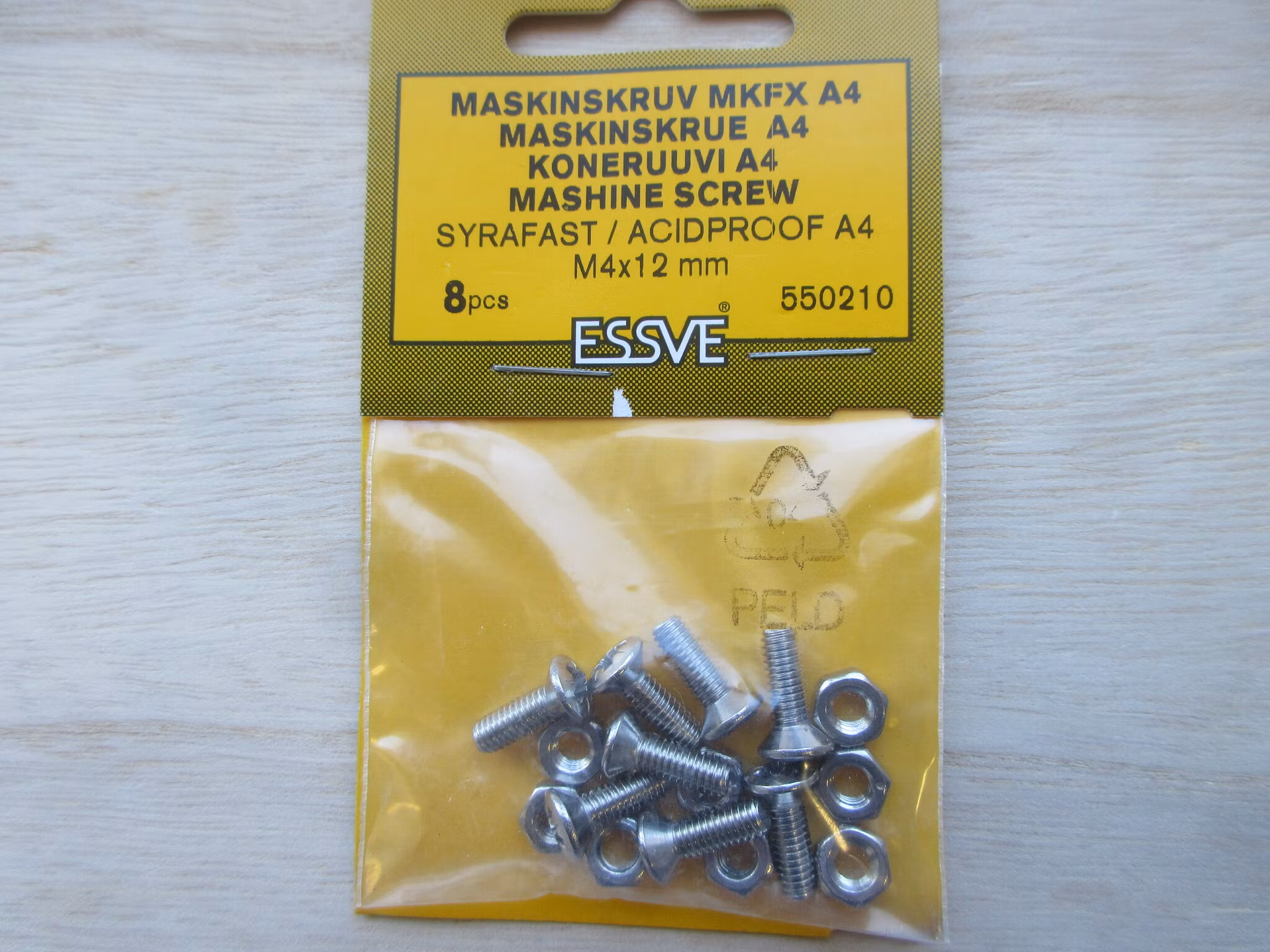 ESSVE Maskinskruv MKFX A4 Syrafast M4x12 mm. 8 st.Maskinskruv MKFX med mutter, rostfri syrafast A4Antal 8 st. Maskinskruv. Samt 8 st mutter.Artnr 5502107317765
