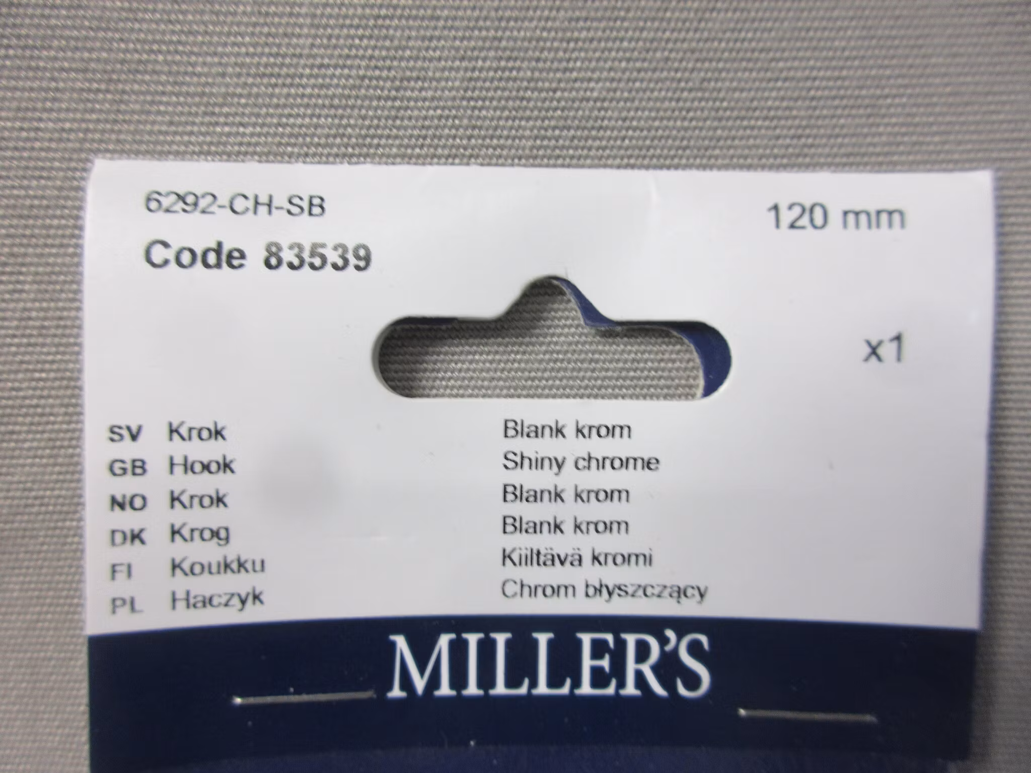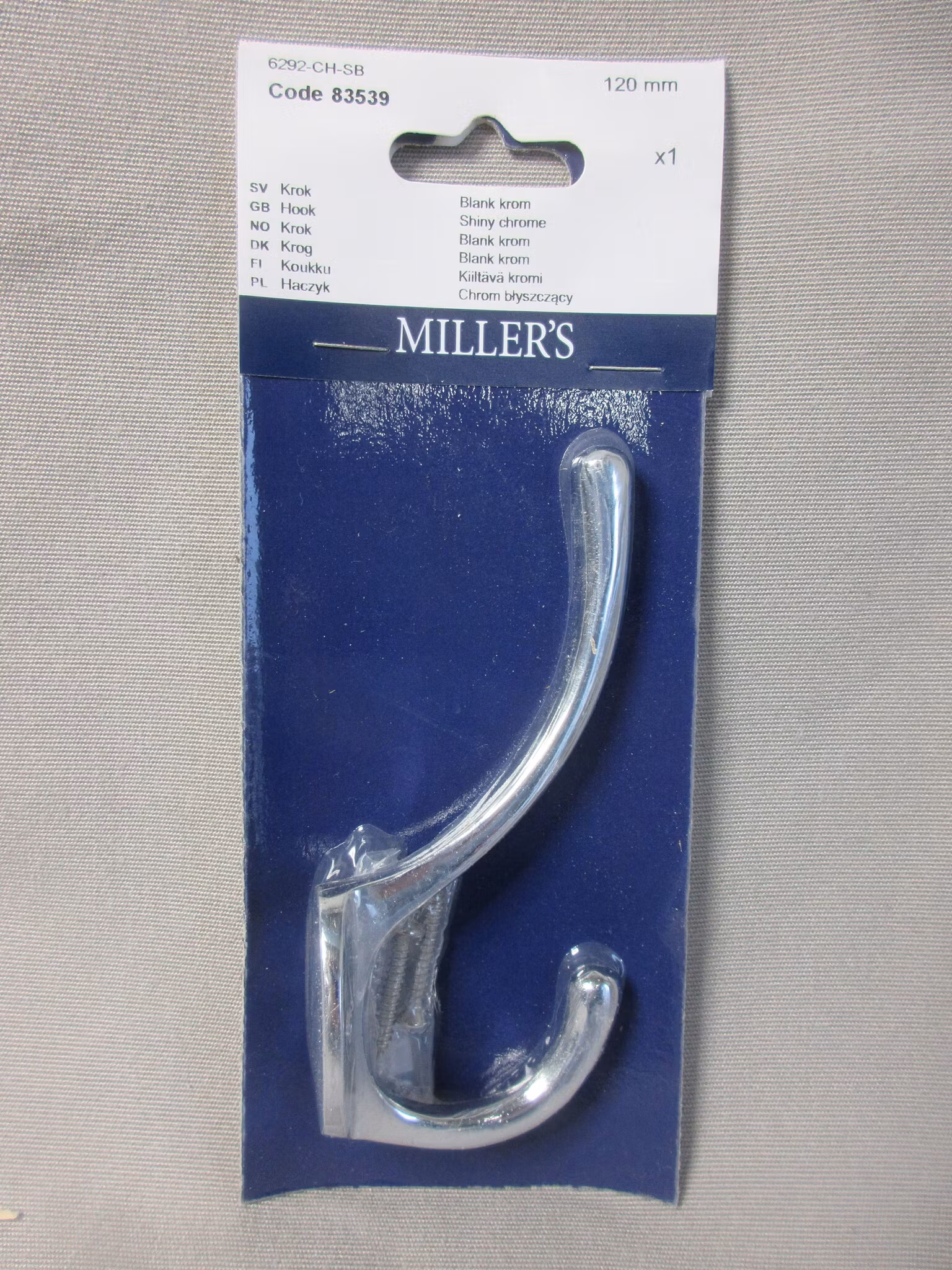 Millers Krok Dubbel Blank krom 83539. 120mm.Code 83539Bredd: 26mmHöjd: 120mmUtsprång: 55Huvudmaterial: MässingYtbehandling: FörkromadETIM-klasskod: EC012075Skru