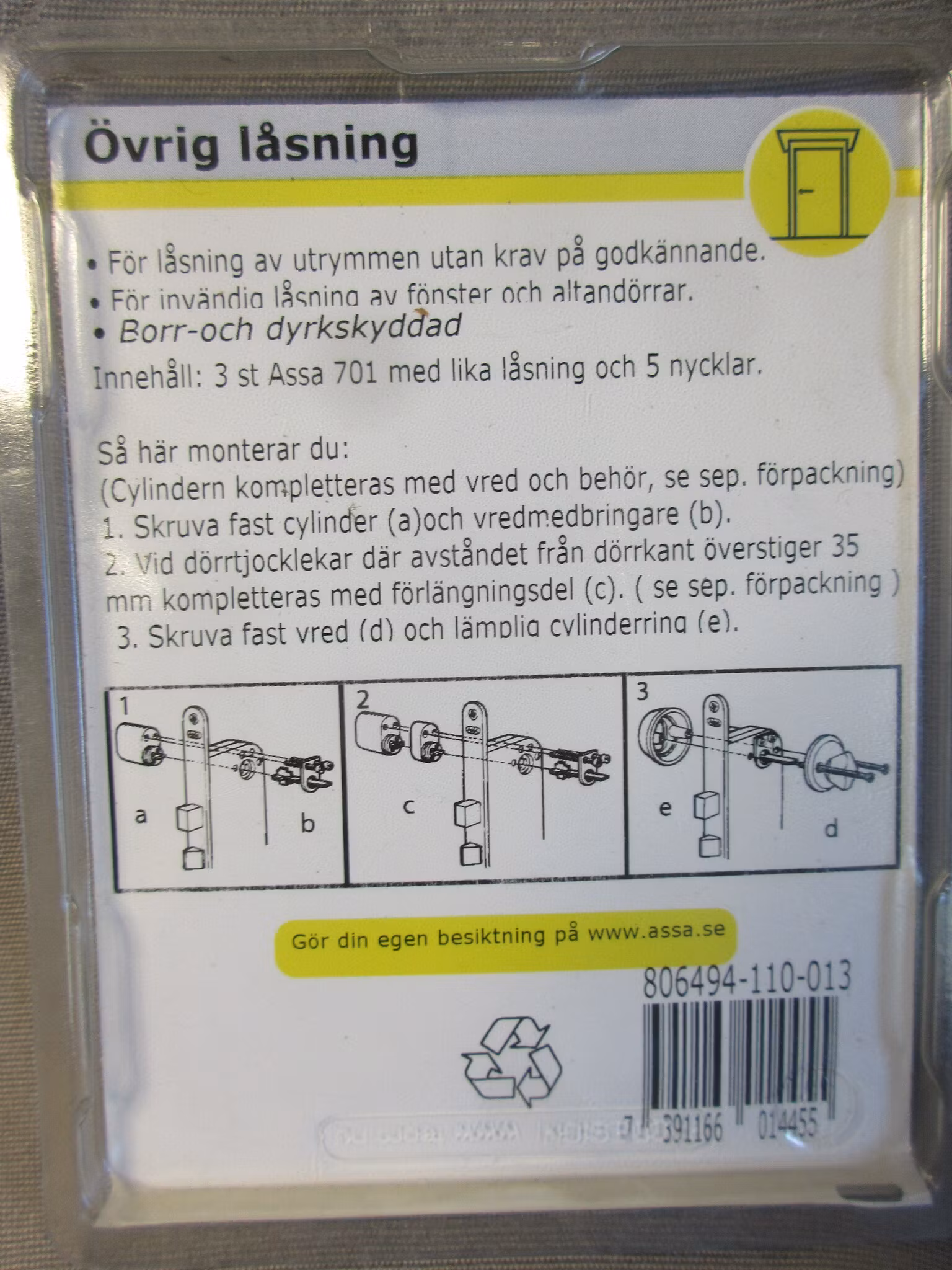 SB-packad ovalcylinder av standardtyp, utsida. Stiftcylinder med 7 spärrelement. Borr-, dyrk- och manipulationsskyddad. För inom- och utomhusklimat. Med eller utan lika låsning. Certifierad enligt SSF 3522 utgåva 2.