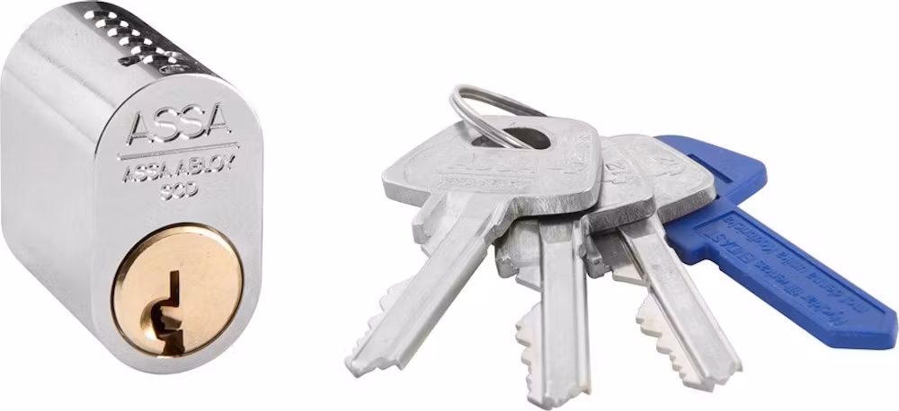 ASSA 1201 är en förnicklad låscylinder med oval form för installation i dörrar där behov av godkänt intrångsskydd inte prioriteras. Uppfyller fordringar enligt SSEN1303, klass 3, för invändig låsning av fönster/fönsterdörrar. För dörrar där godkänd låsning krävs, använd rund cylinder typ d12 1212 / Basic 1312. Cylindern levereras med tre nycklar och kodbricka.