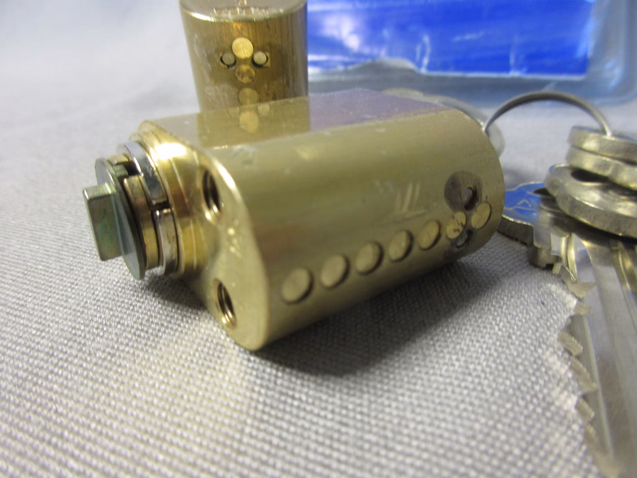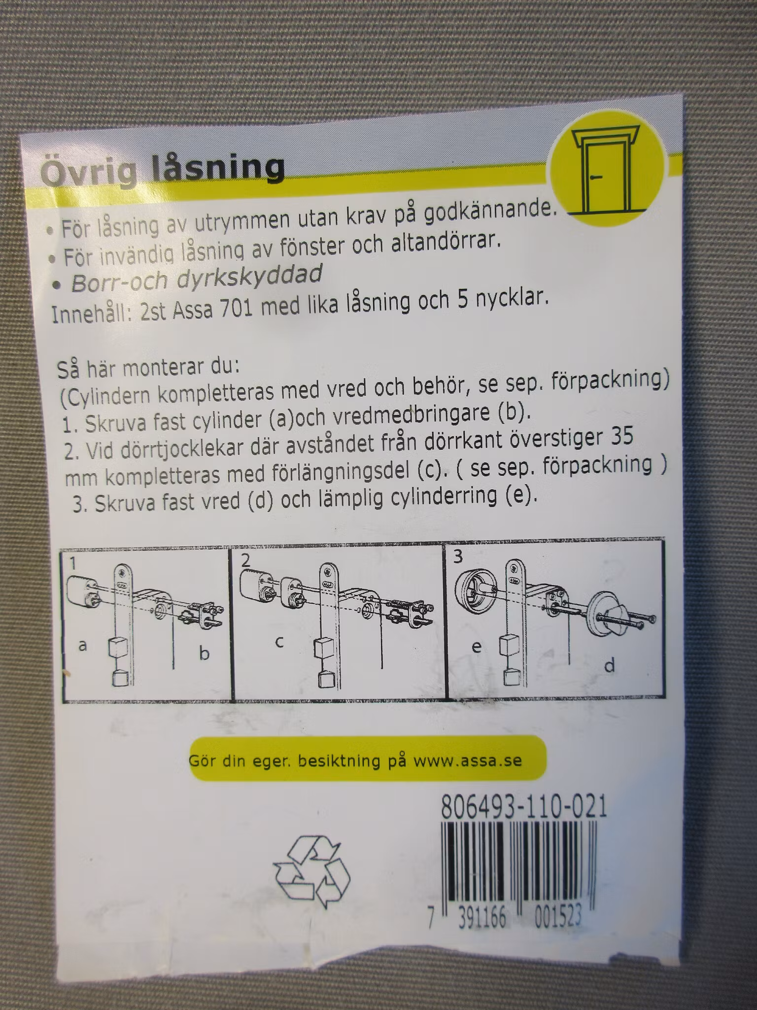 SB-packad ovalcylinder av standardtyp, utsida. Stiftcylinder med 7 spärrelement. Borr-, dyrk- och manipulationsskyddad. För inom- och utomhusklimat. Med eller utan lika låsning. Certifierad enligt SSF 3522 utgåva 2.
