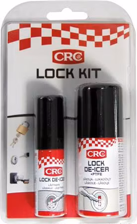 CRC kit avisningsmedel 15 ml & Lock PTFE 40 ml. Lättanvänd spray för problemfri öppning av dörrar. LOCK DE-ICER: En effektiv låsspray som snabbt avfrostar och rengör lås. Den komplexa blandningen avisningar, rengör och smörjer snabbt alla typer av låskomponenter. Det förhindrar också att eventuella lås fryser och skyddar mot korrosion. LOCK DE-ICER + PTFE: En lättanvänd spray för problemfri öppning av dörrar. Den komplexa blandningen med PTFE avisningar och smörjer snabbt alla typer av lås. Det förhindrar också att eventuella lås fryser och korroderar. CRC-låssats spraya, avfrosta, rengöra, smörja. Lättanvänd låssats för problemfri öppning av dörrar.