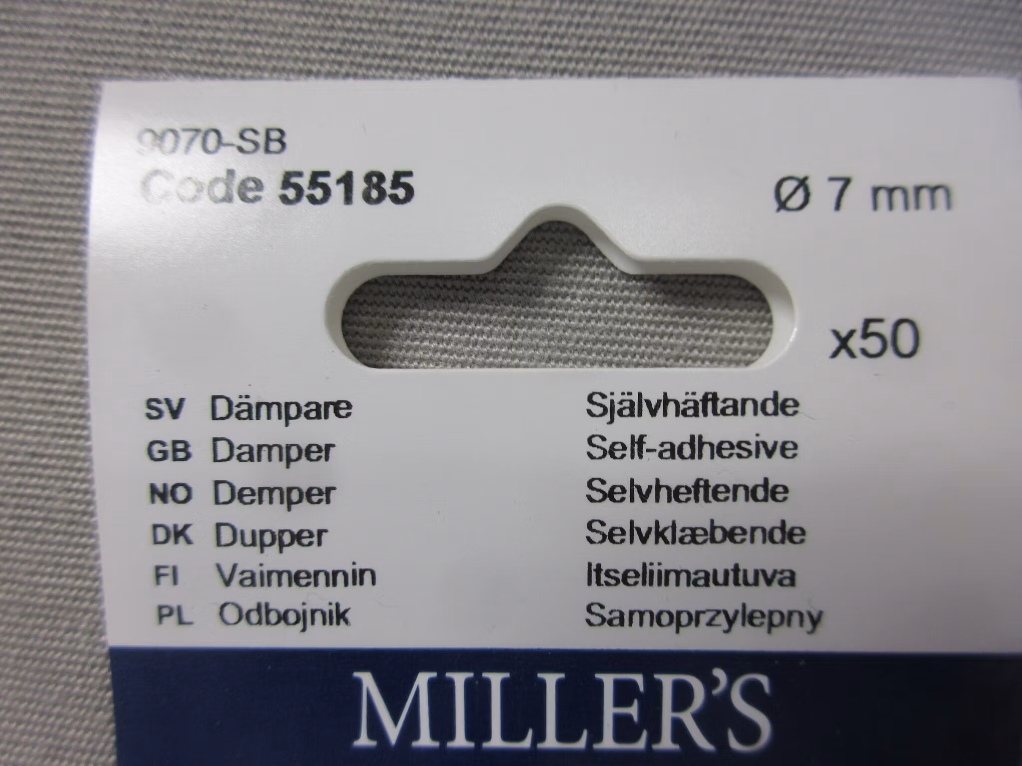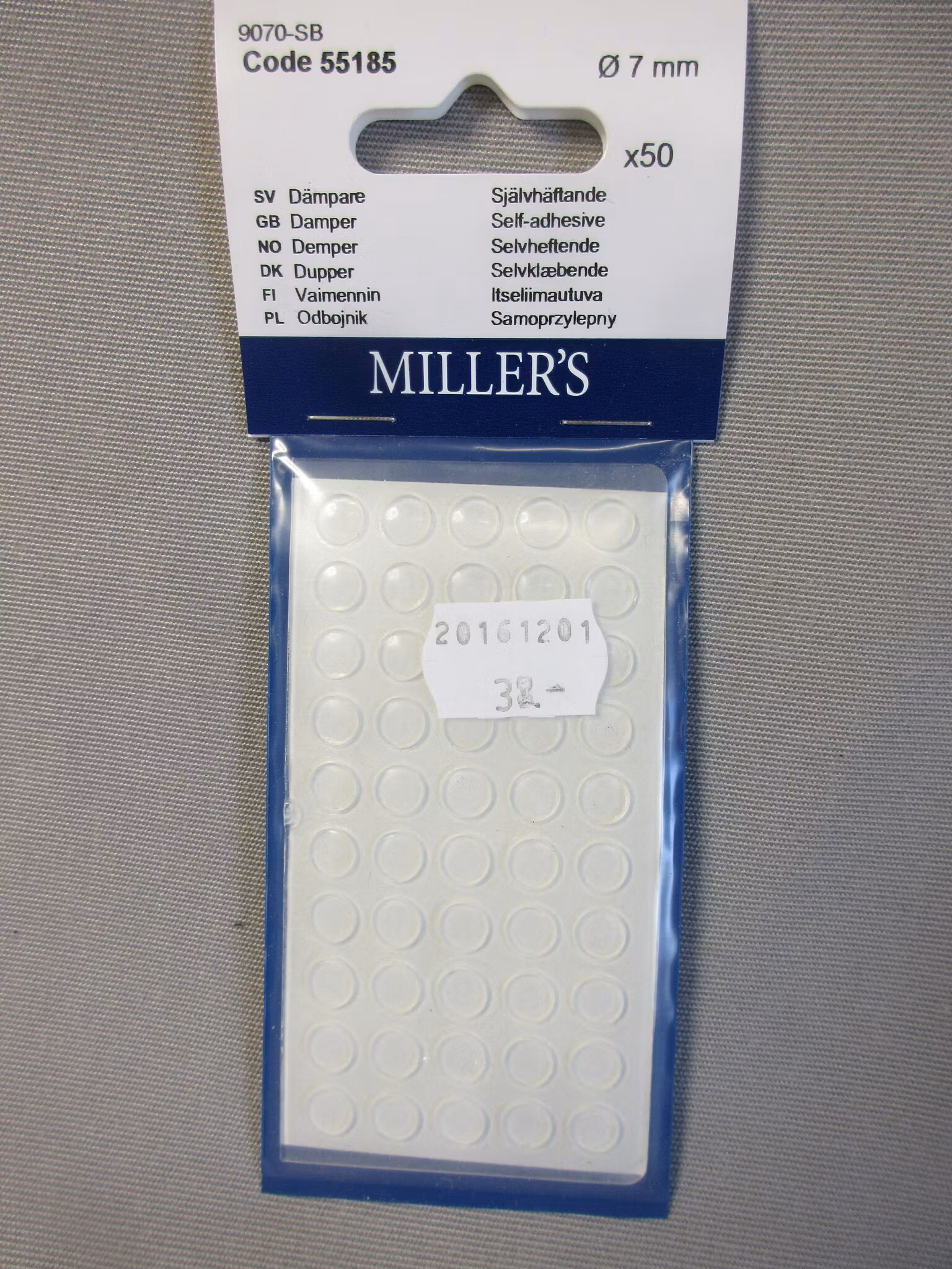 Millers Dämpare 7 mm. 50 st.Självhäftande dämpare för dörrar och luckor. Transparent plast.Mått 1,5x7 mm.Antal 50 st.