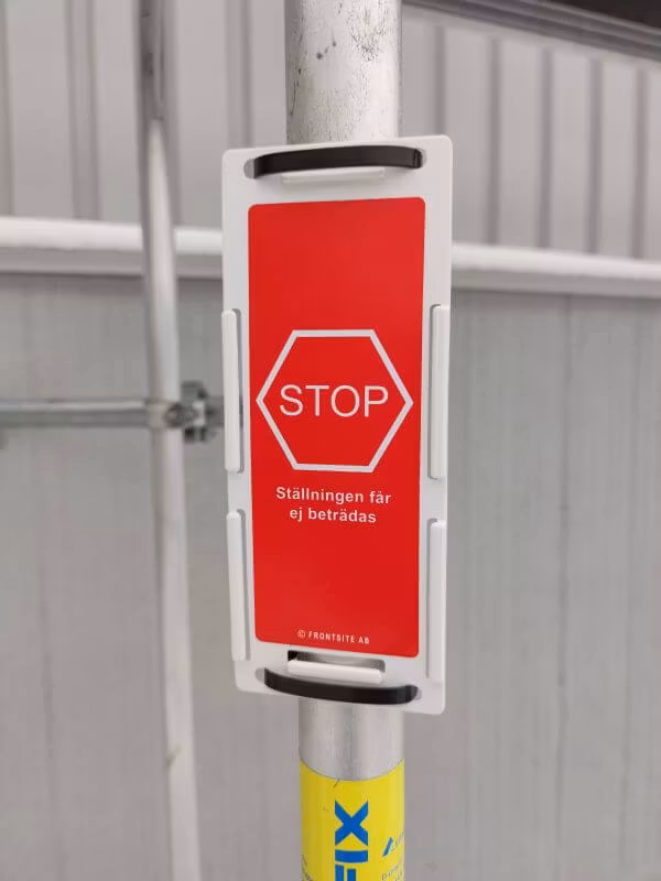 Hållaren har ett tydligt stoppbudskap som visas när grönskyltarna ej är på plats, detta för att visa om man kan beträda ställningen eller ej.