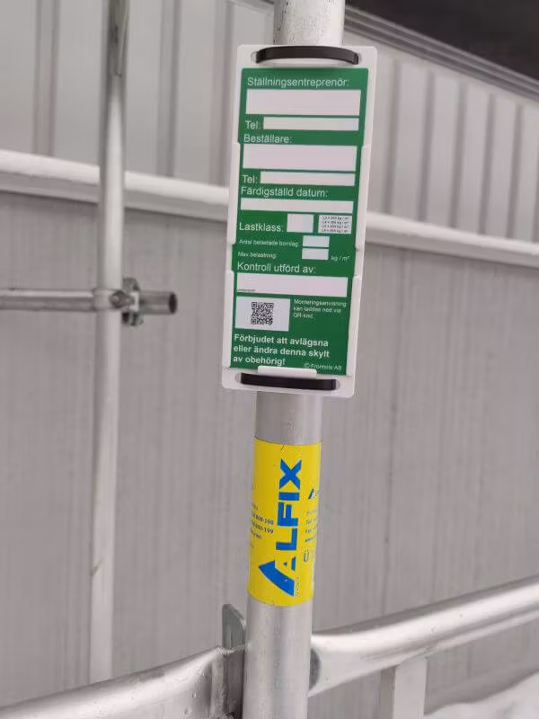 Vår ställningsskylt har en unik QR-kod som man scannar in för att få tillgång till monteringsanvisningarna för de flesta fabrikat av byggställning ex. Peri, +8, Haki m.m.