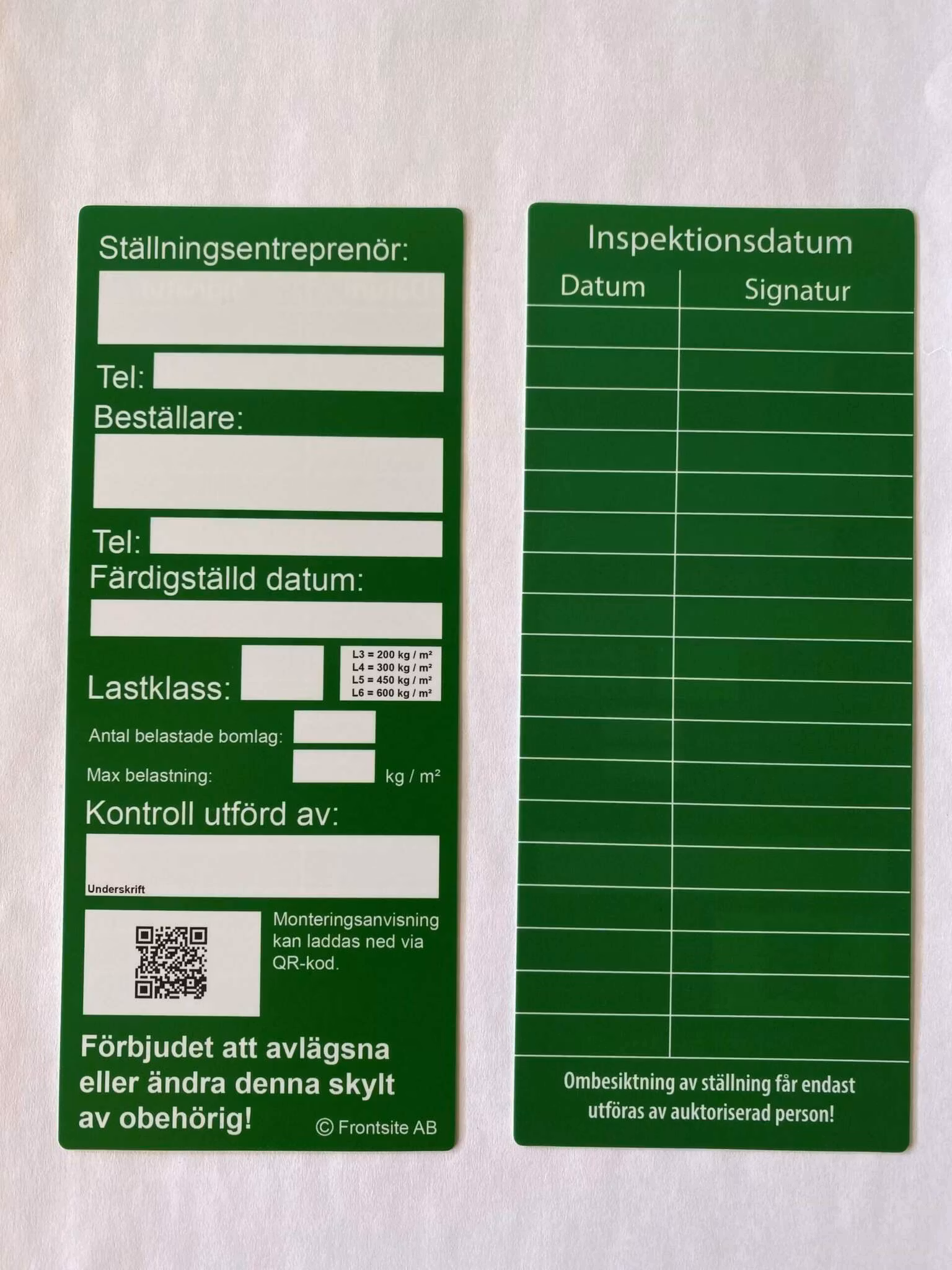 Ställningsskylt (s.k. grönskylt) med uppgifter på ställningens kvalifikationer. ex textfält för ställningsentreprenör, ställningsbeställare.