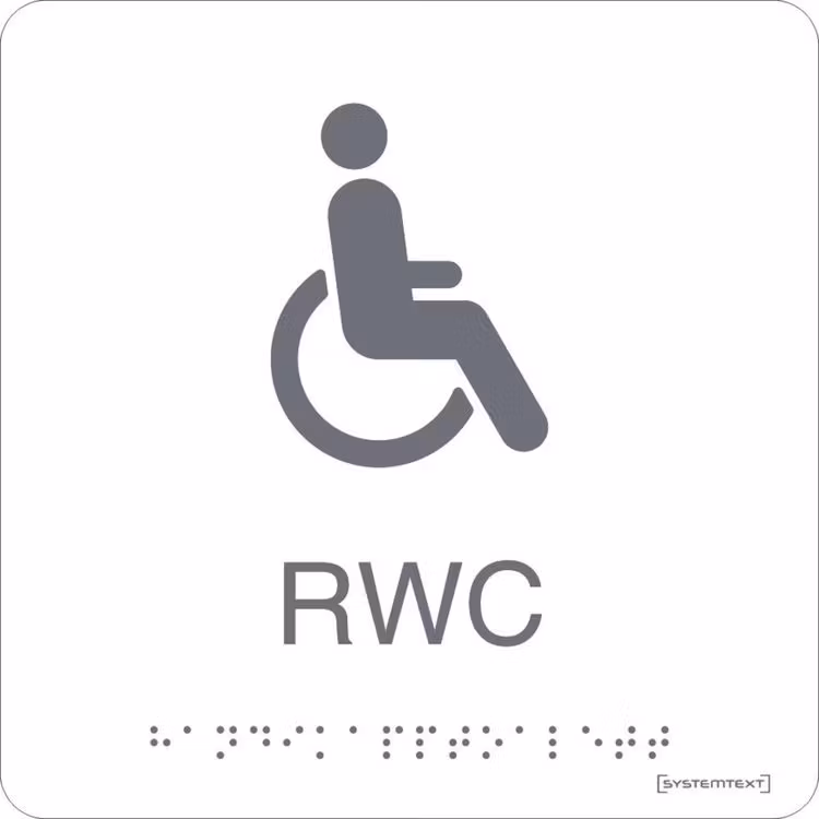 Taktil skylt med upphöjd text och symbol samt punktskrift "RWC". Vit skylt i 1,6 mm hårdplast för montering på mörk vägg.