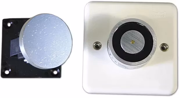 Dörrupphållarmagnet i EM 500 G serien. Elektromagnet för uppställning av branddörrar. För utanpåliggande montage. Driftspänning 24 VAC/DC. IP Klass 40. Hållkraft 400 N. Inbyggt remanensstift för eliminering av kvarhållen magnetism.