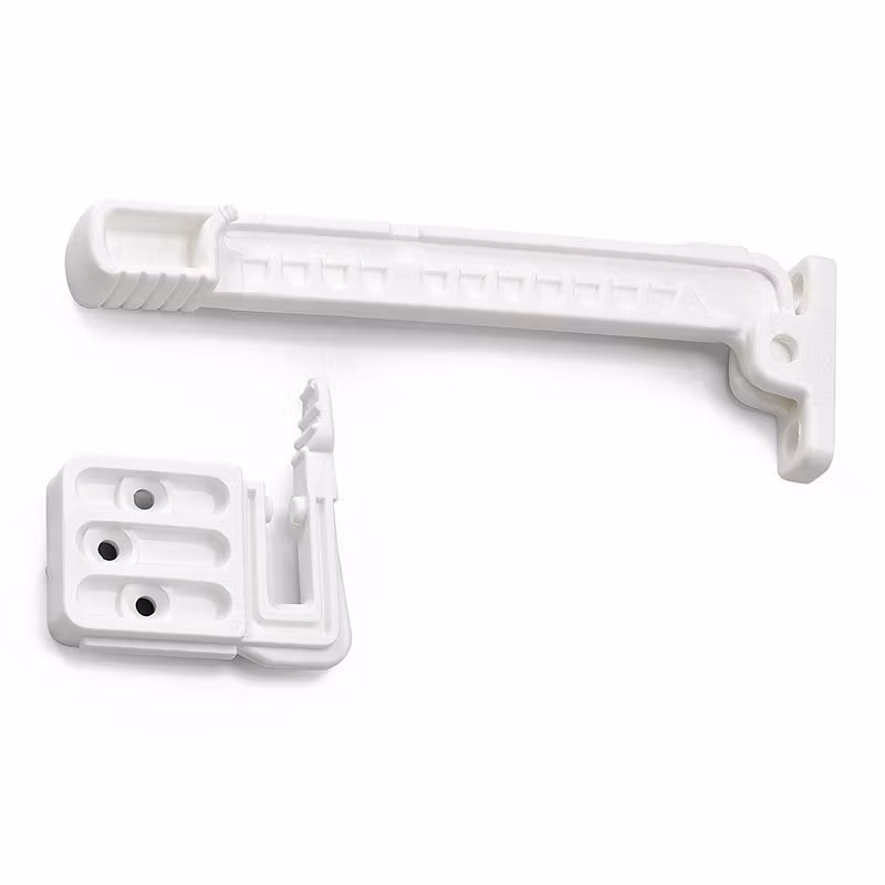 Vädringsbeslag för inåtgående fönster i vit plast.