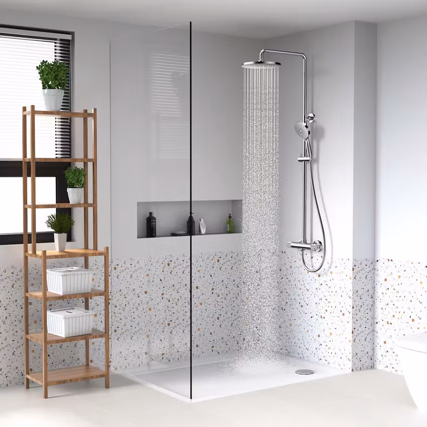 Specifikationer Vattentryck 20 l i minuten Färg: krom SINTEF-godkänd Justerbar höjd på huvudduschen Tekniska specifikationer Takdusch: Ø250 mm Duschstångsdiameter: Ø22/Ø25 mm Duschstångens höjd teleskopisk: 90 - 123 cm Duschslang PVC: 1500 mm Avstånd väggfäste från blandare: 84,5 cm Handdusch: 3 inställningar EAN 7072742501384