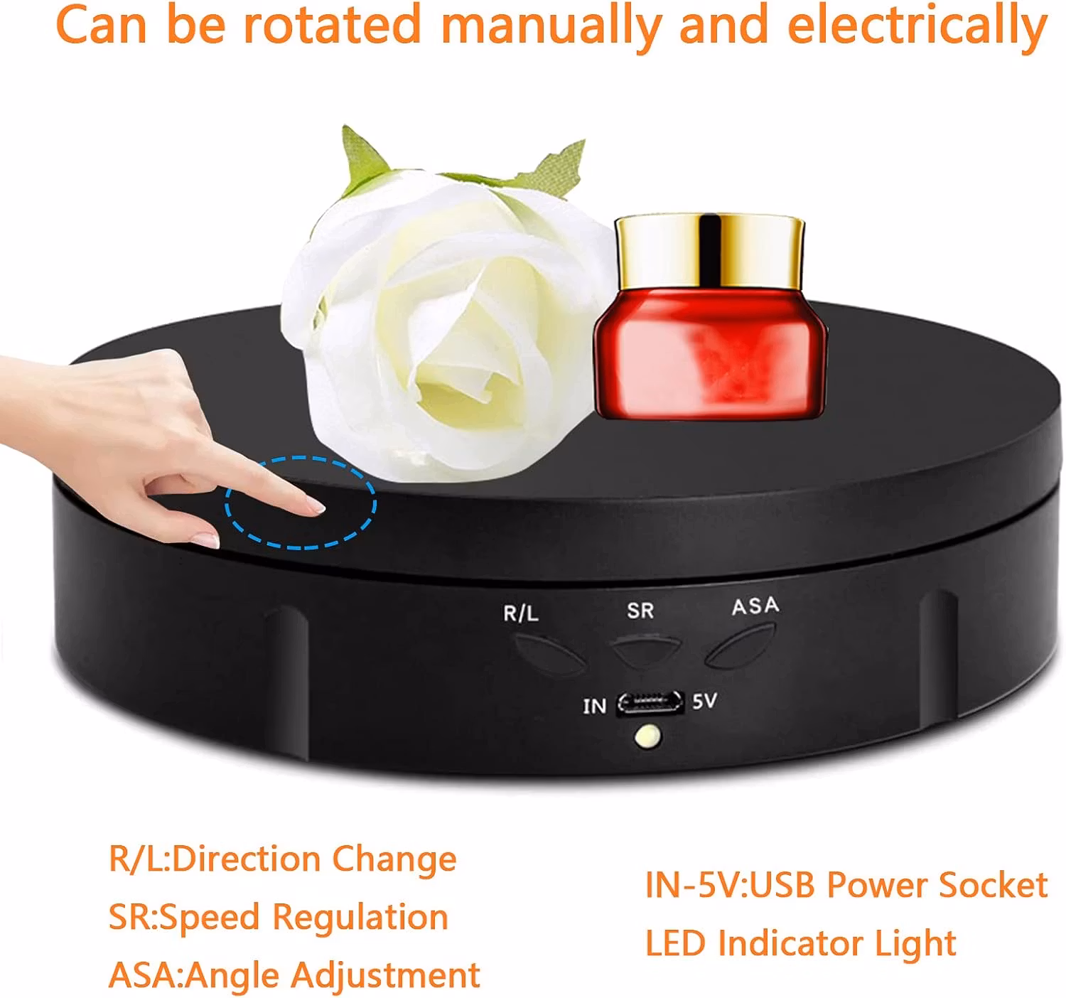 Lätt att använda: 360 graders roterande displaystativ, stöd medurs och moturs. Genom att slå på/av-knappen ändras rotationsriktningen. Produkthastighet: 8, 15, 30 sekunder/varv kan du justera efter olika behov.