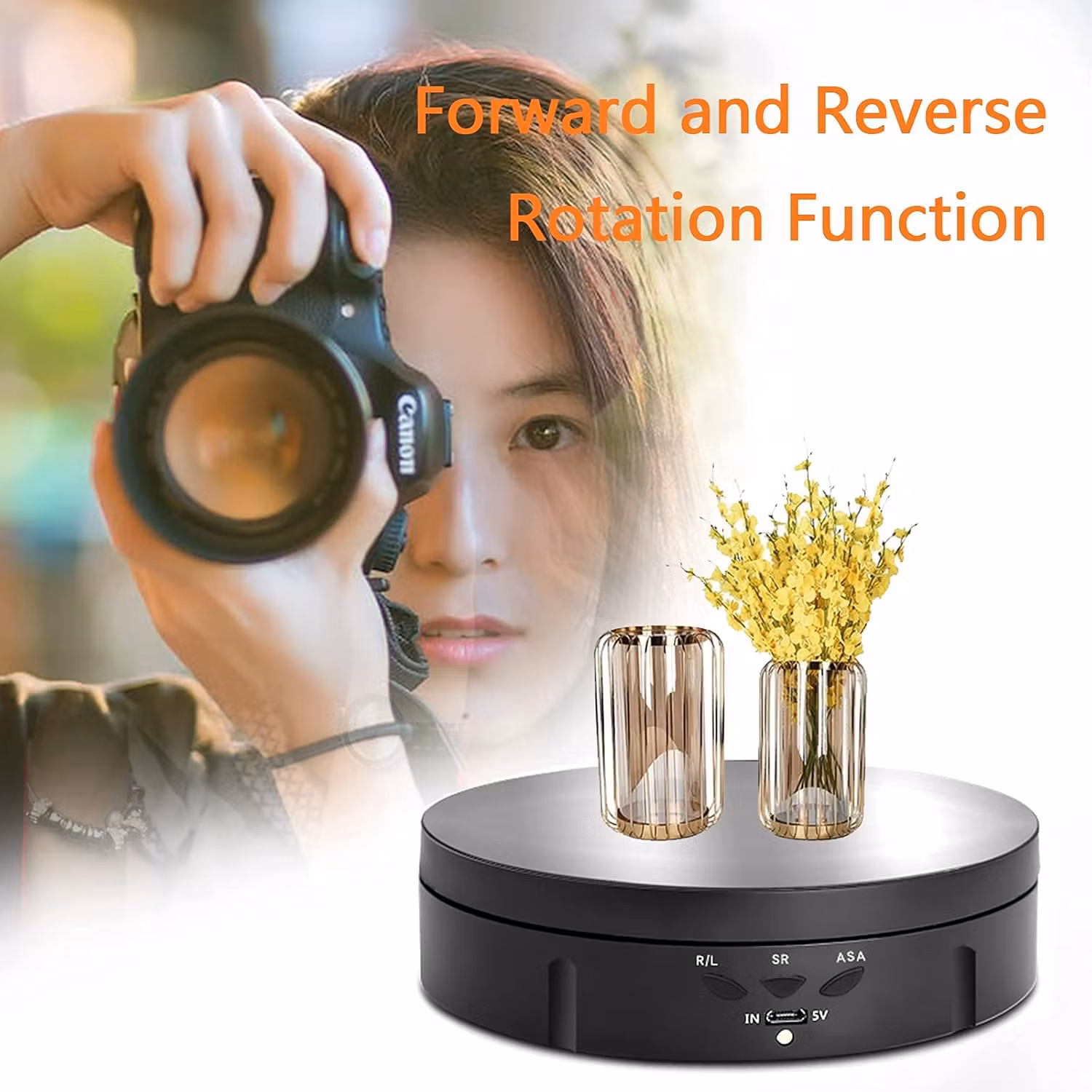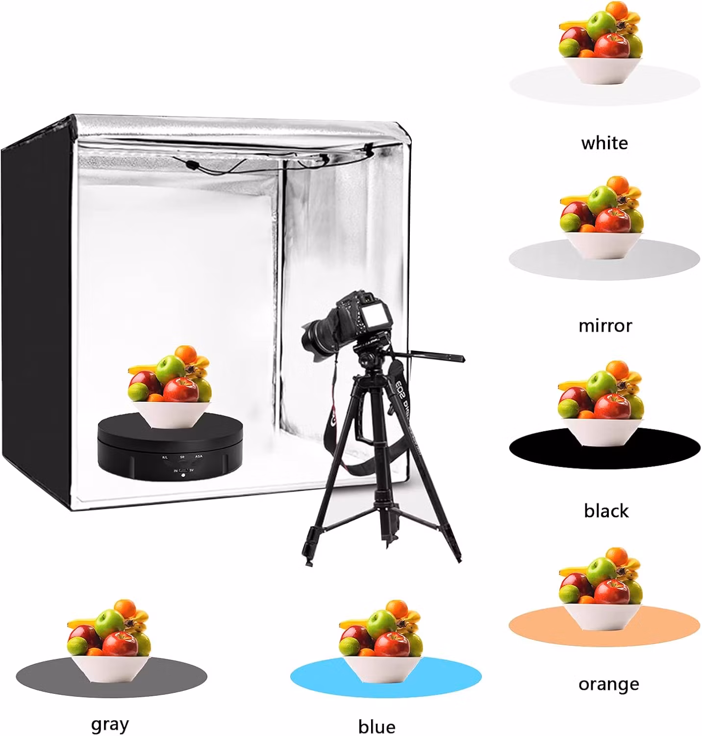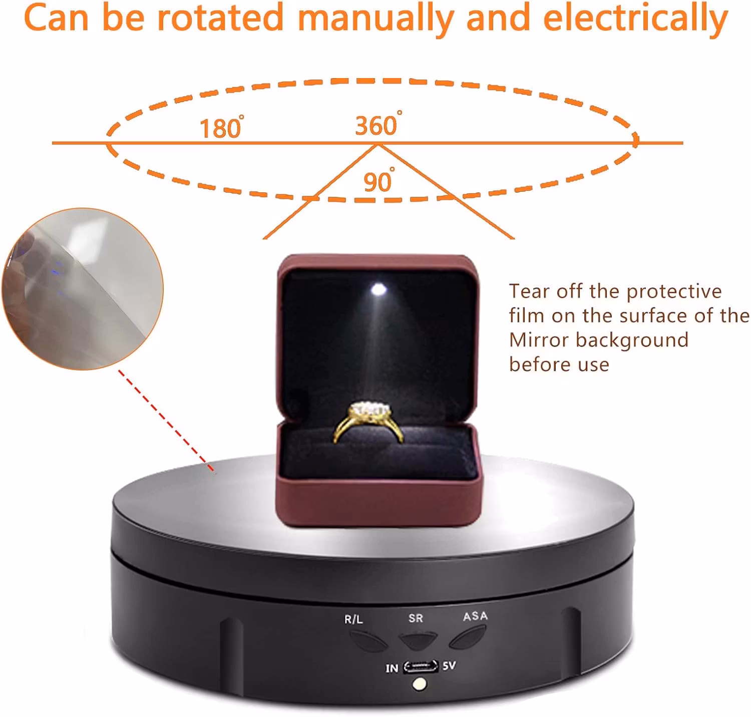 Kontrollerbar hastighet, justerbar riktning och vinkel. 3 alternativ: R/V för riktning medurs/moturs. SR för hastighetsreglering 2-4-7,5 varv per minut. ASA kan justera rotationsvinkeln 90-180-360° och sedan cirkla. Och vår roterande skivspelare levereras med 6 PVC-bakgrunder. Spegel+Svart+Vit+Grå+Gul+Blå), du kan välja den bakgrund du vill.