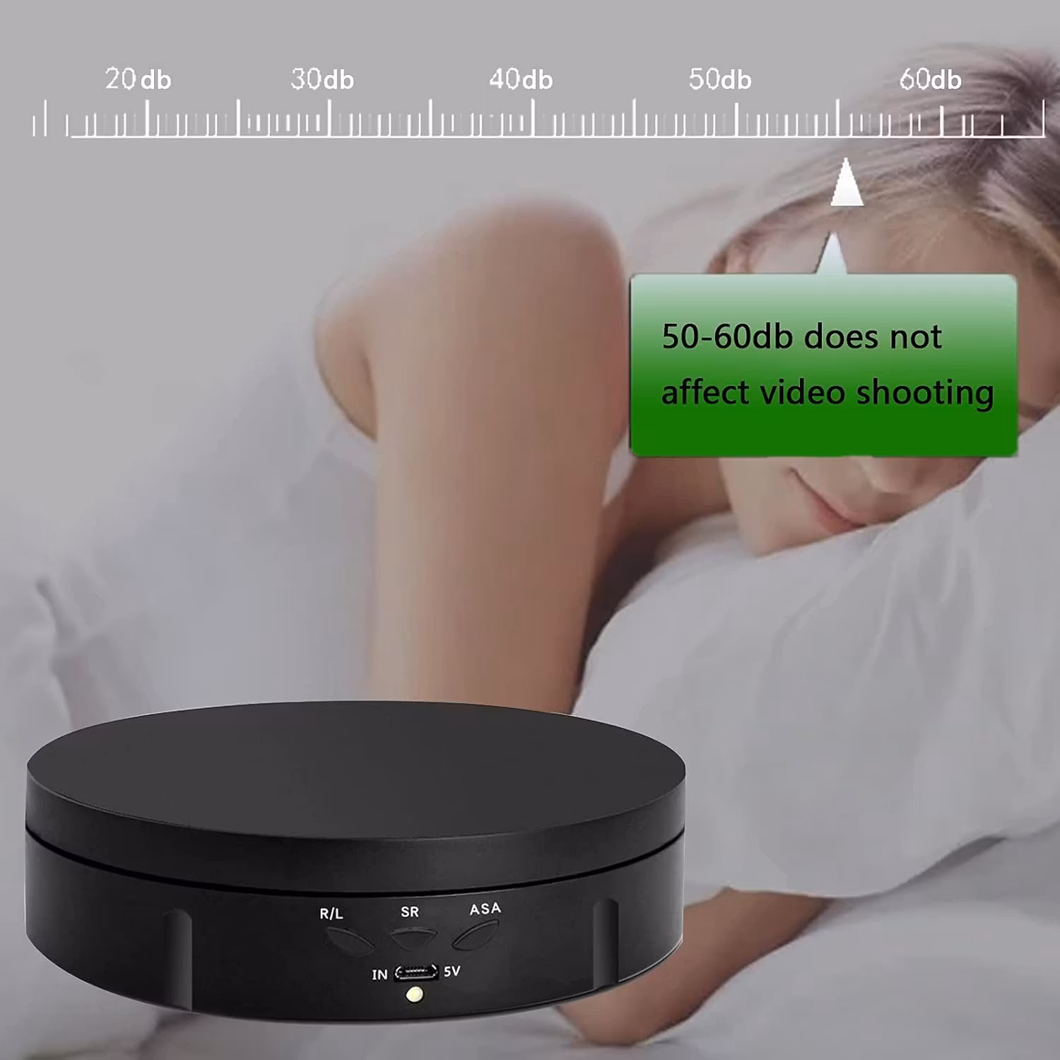 Tyst och jämn rotation: Skivspelarens stativ är tystgående och har låg strömförbrukning. Detta elektriskt roterande displaystativ är tystgående och påverkar inte din videoinspelning. Obs: Det är normalt att det kan uppstå skakningar på grund av rotationströgheten när rotationsvinkeln ändras.