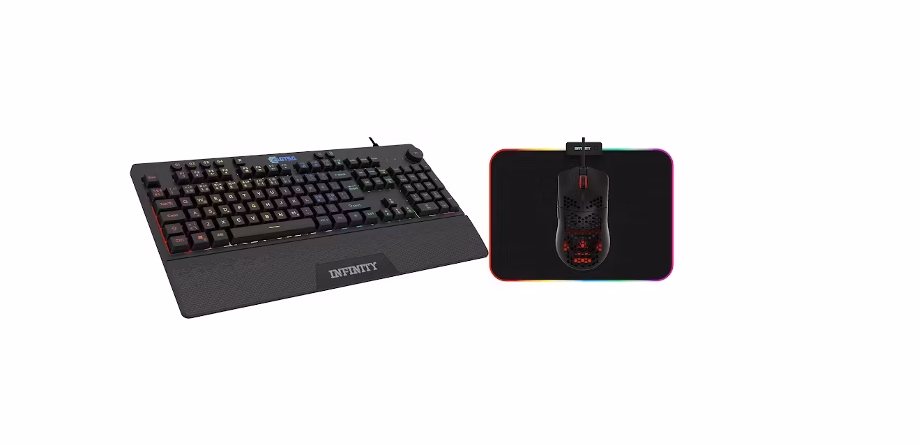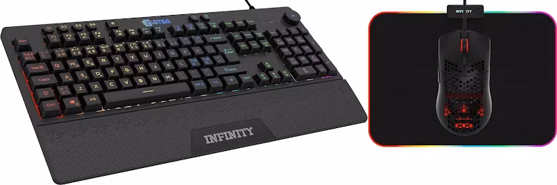 Infinity gamingpaket med RGB tangentbord, mus och musmatta.