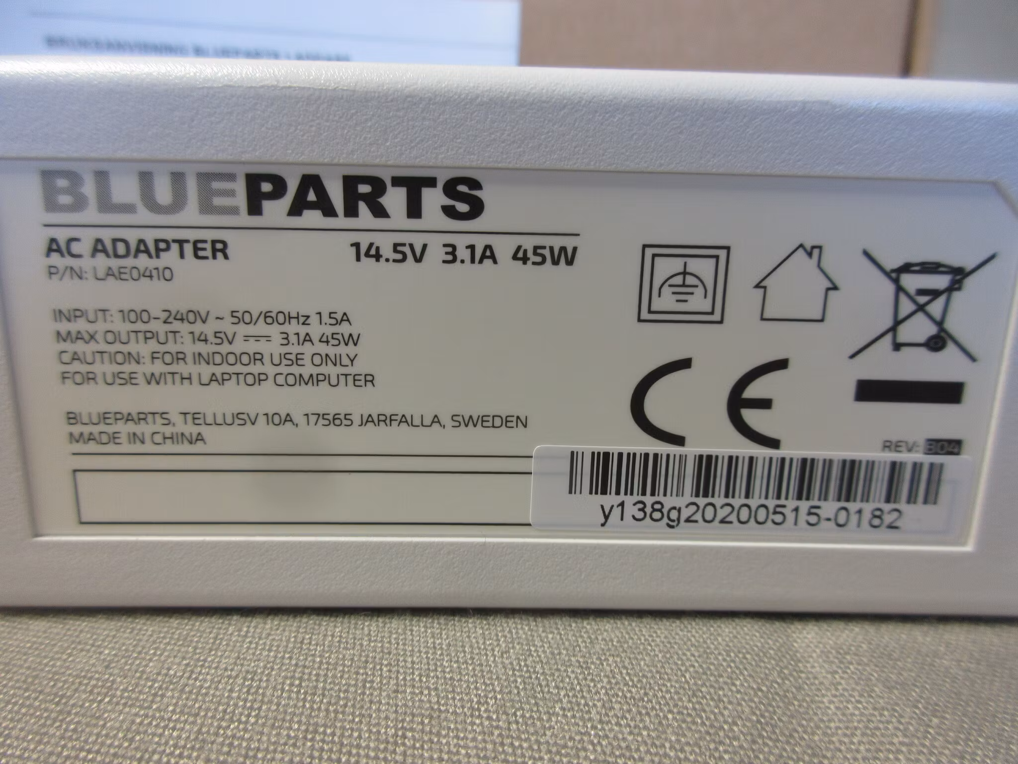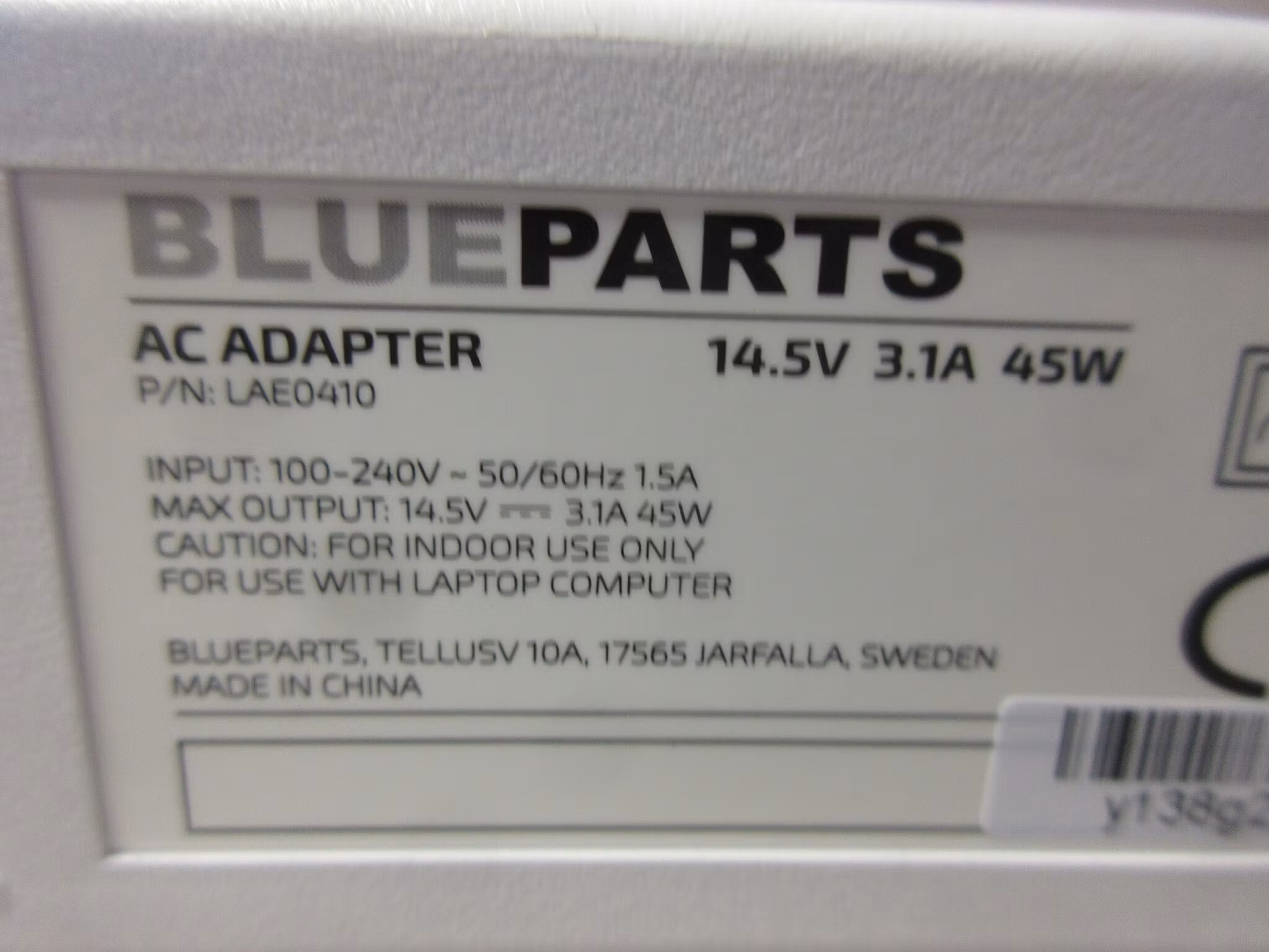 Blueparts Laptop AC Adapter 14.5V 3.1A 45WLAE0410 Laptop Adapter 45WInput 100-240V. 1.5AMax Output 14.5V. 3.1A 45W