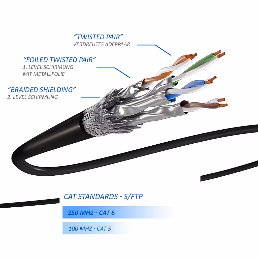 De har särskilt ledande, guldpläterade kontaktytor som säkerställer förstklassig, förlustfri dataöverföring. Kopparkablarna av hög kvalitet har en innovativ dubbel skärmning (S/FTP PIMF - folie + fläta).
