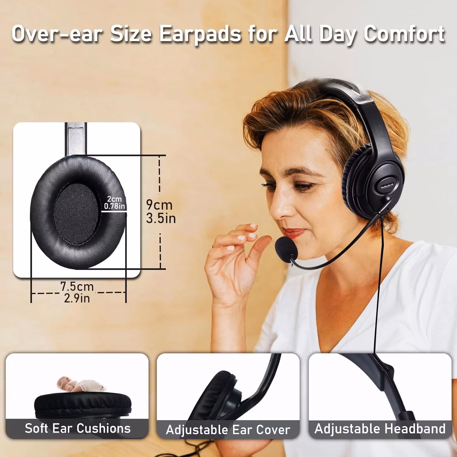 Bekväma att bära: 108U USB-hörlurar har mjuka öronkuddar i syntetiskt läder. Pannbandet är justerbart för att passa vilken huvudform som helst. Mikrofonarmen kan vridas 300 grader och mikrofonstången kan böjas fritt. Du kan välja att bära mikrofonen på vänster eller höger sida utan problem. 108U-hörlurarna är ergonomiskt utformade för långvarig användning utan att klämma i örat och utan tryck. Designad för affärssamtal, callcenter, videokonferenser, fjärrarbete på kontoret.