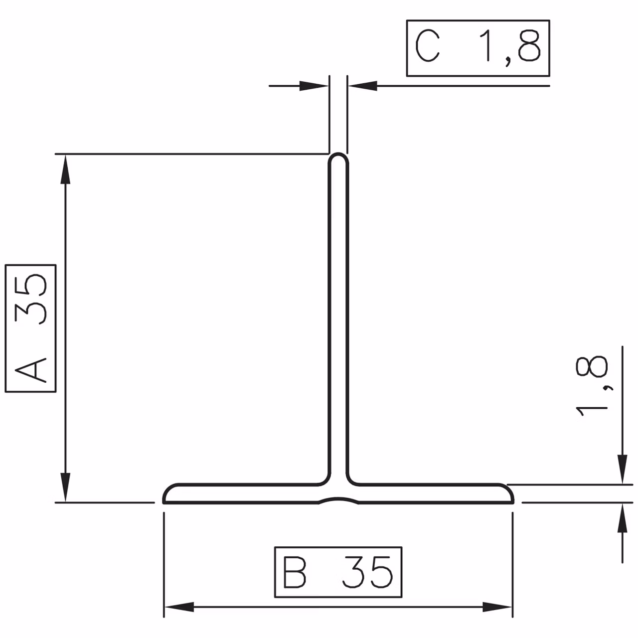 Denna T-list har grå färg, är 2 meter lång och 35 mm hög. Foten är 35 mm bred.