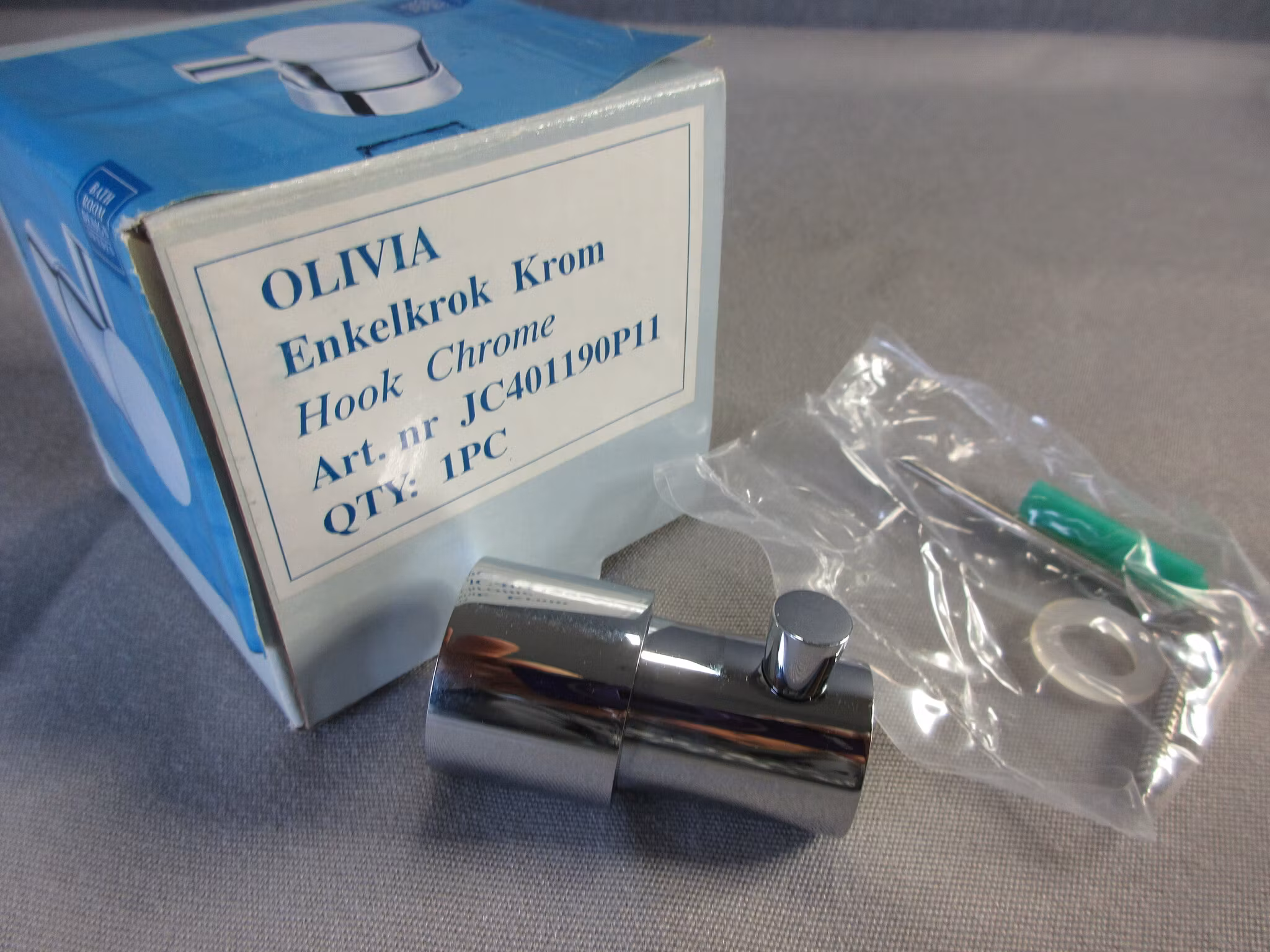 Enkelkrok Olivia Polerad kromArt. Nr JC401190P11Skruv för traditionell montering ingår.Längd 5 cm.Diameter 2,8 cm.Designad av Bath Room Design Sweden