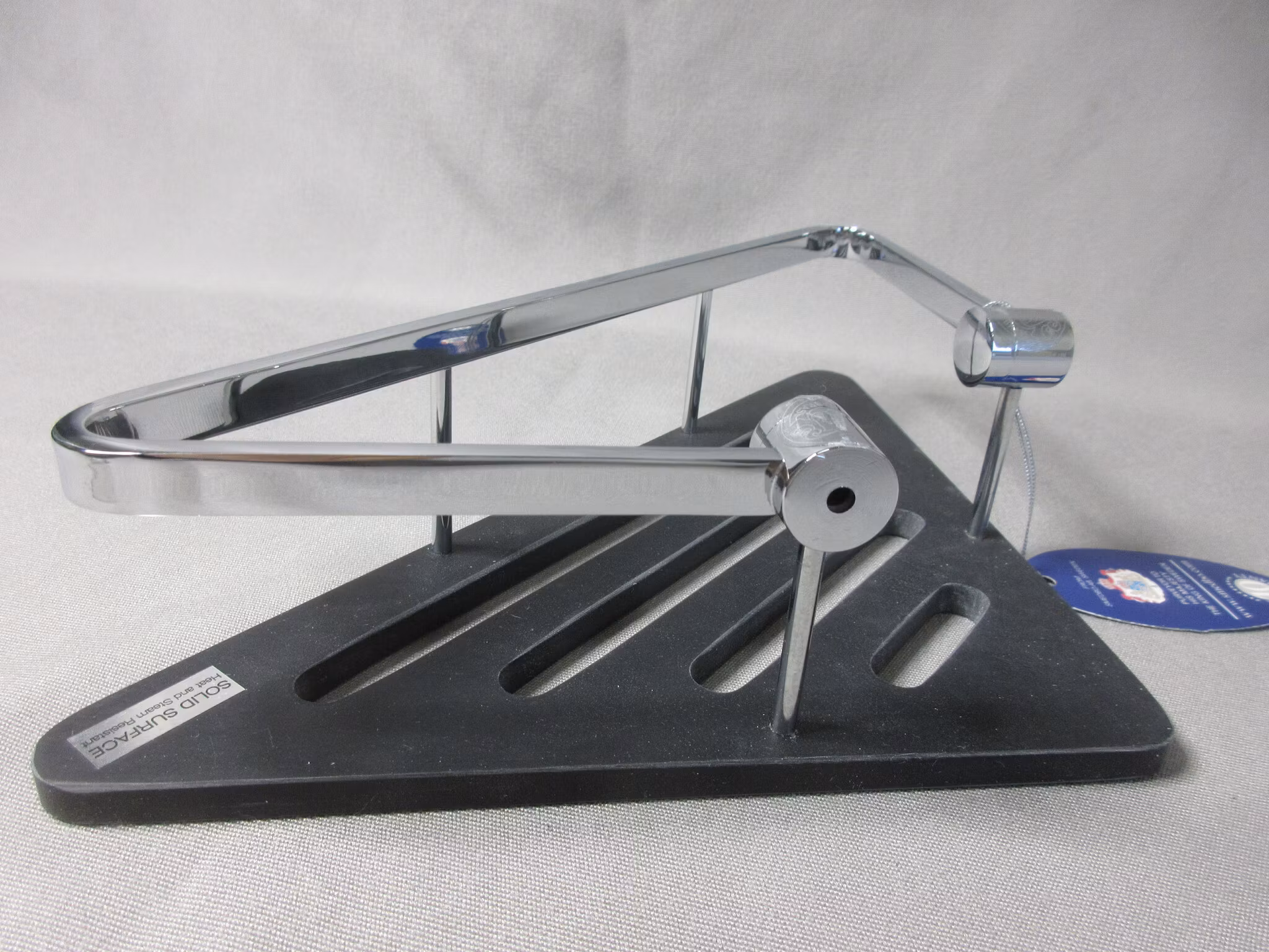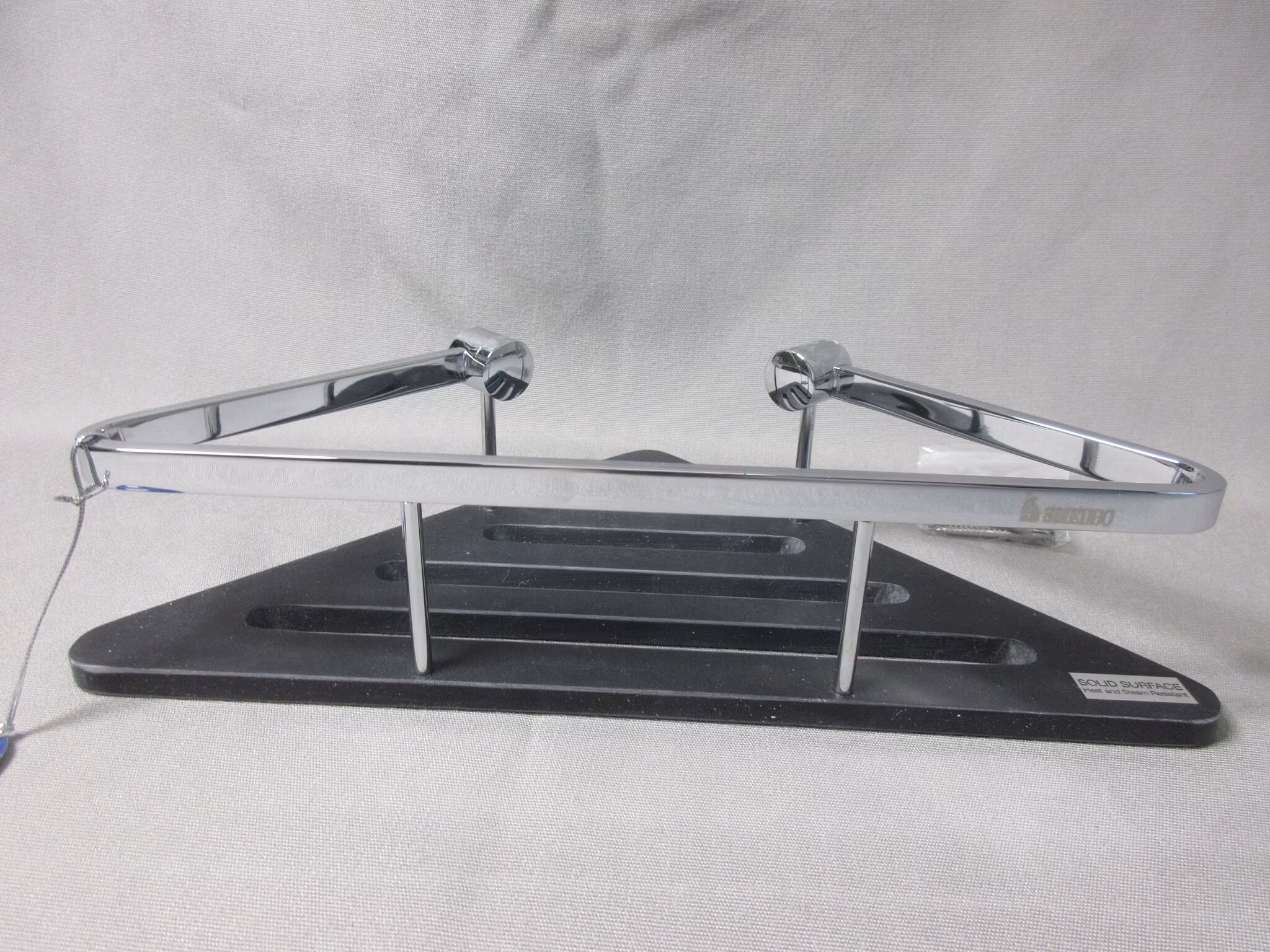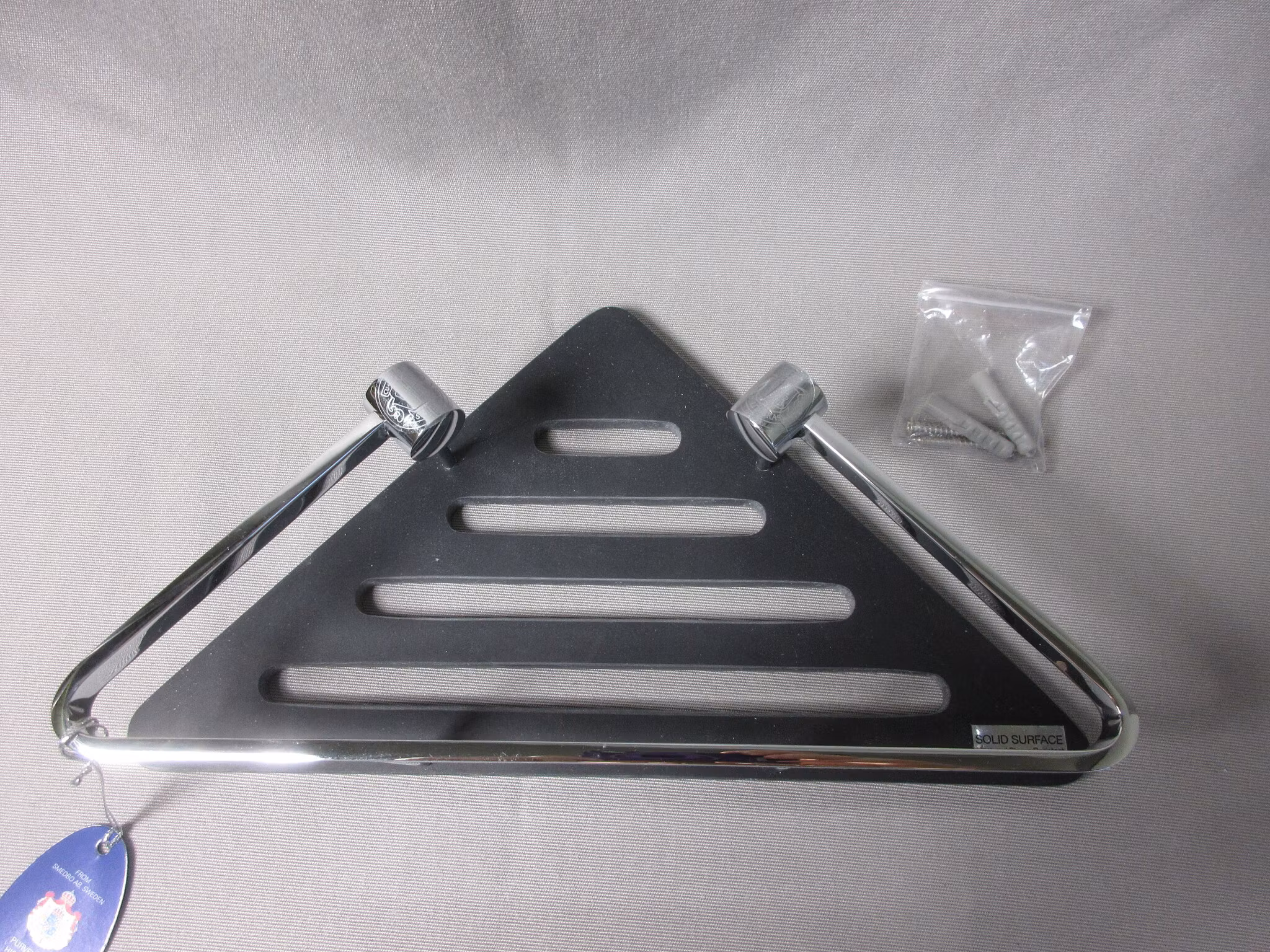 Tvålkorg hörn i polerad krom med bottenplatta i svart. Dold fastsättning.
