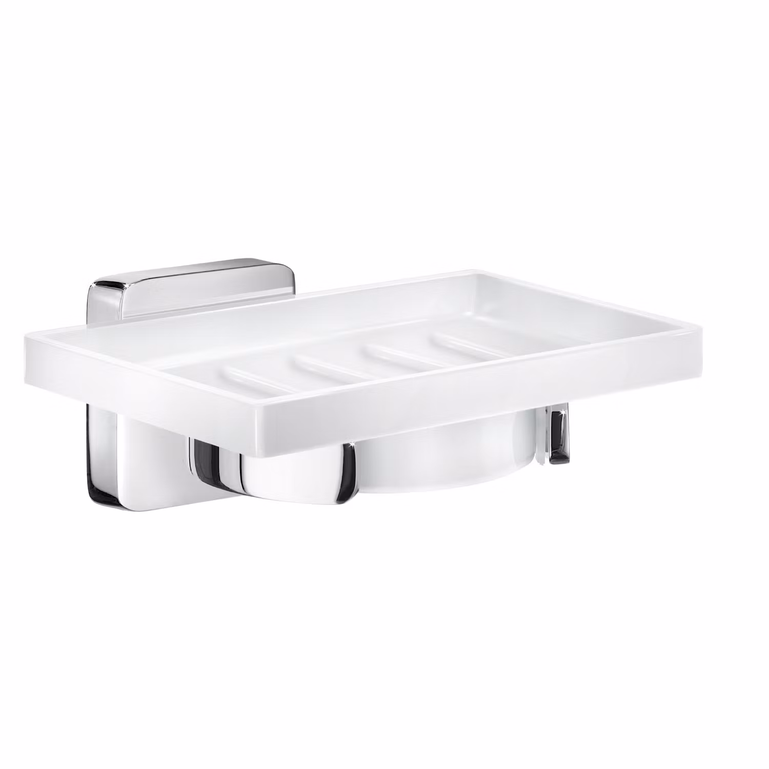 Hållare med tvålkopp i porslin. Hållare i polerad krom. Dold fastsättning. Löstagbar tvålkopp för enkel rengöring. De monteringsplattor som medföljer produkten är anpassad för montering med skruv