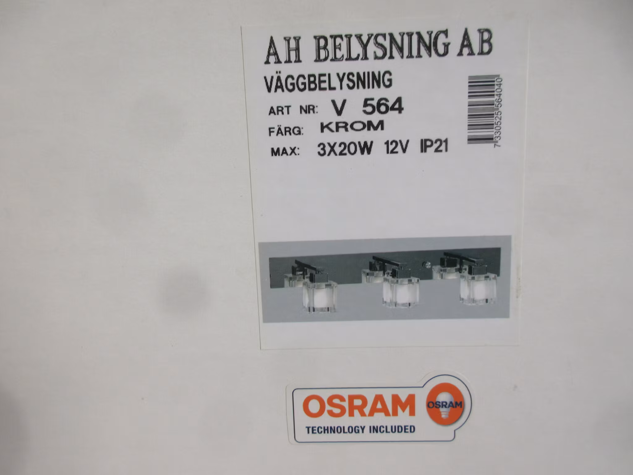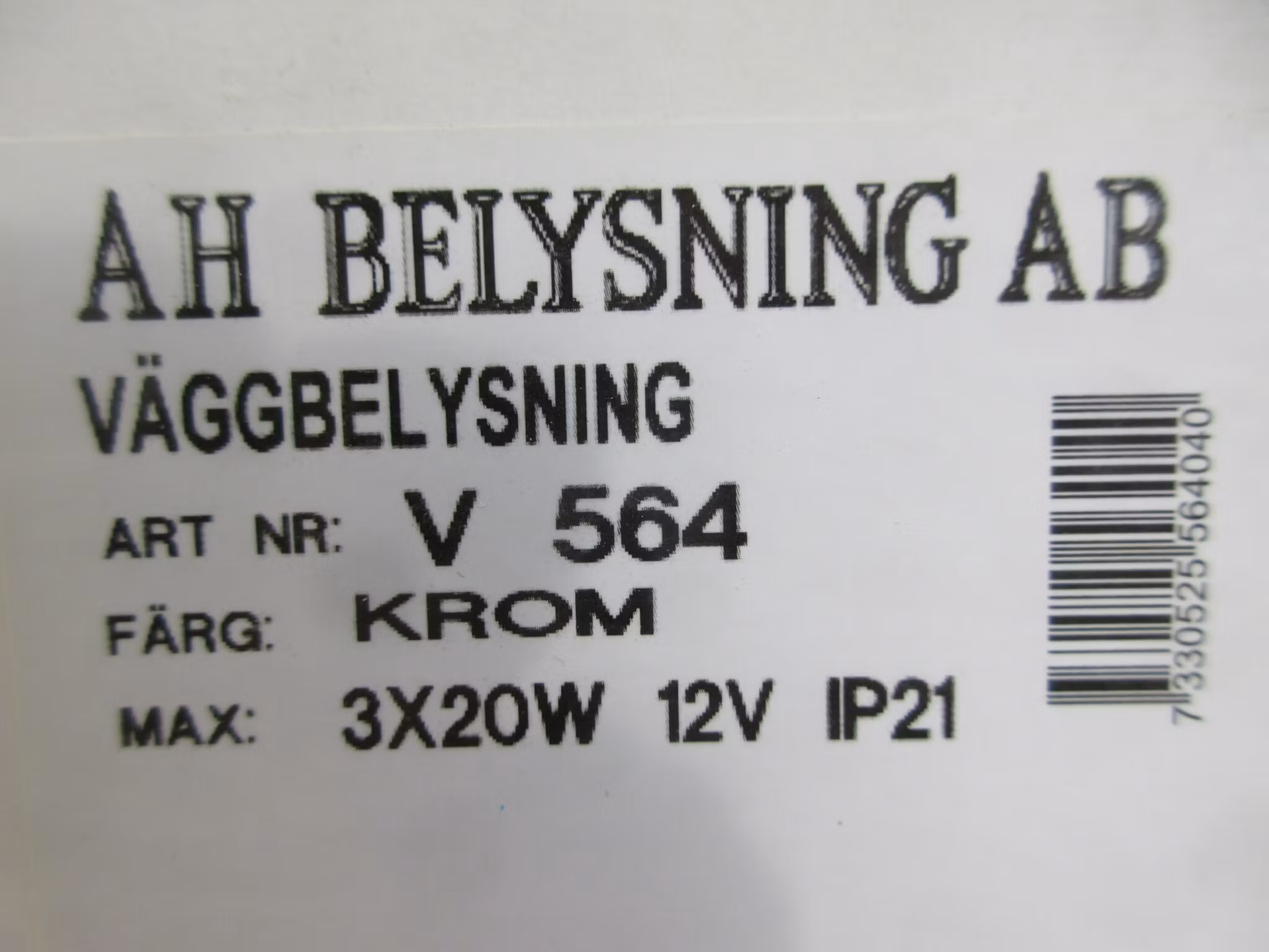 AH Belysning Badrumsarmatur IP44. V564Art nr V 564Färg KromMax 3x20W 12VIP21EAN 7330525564040