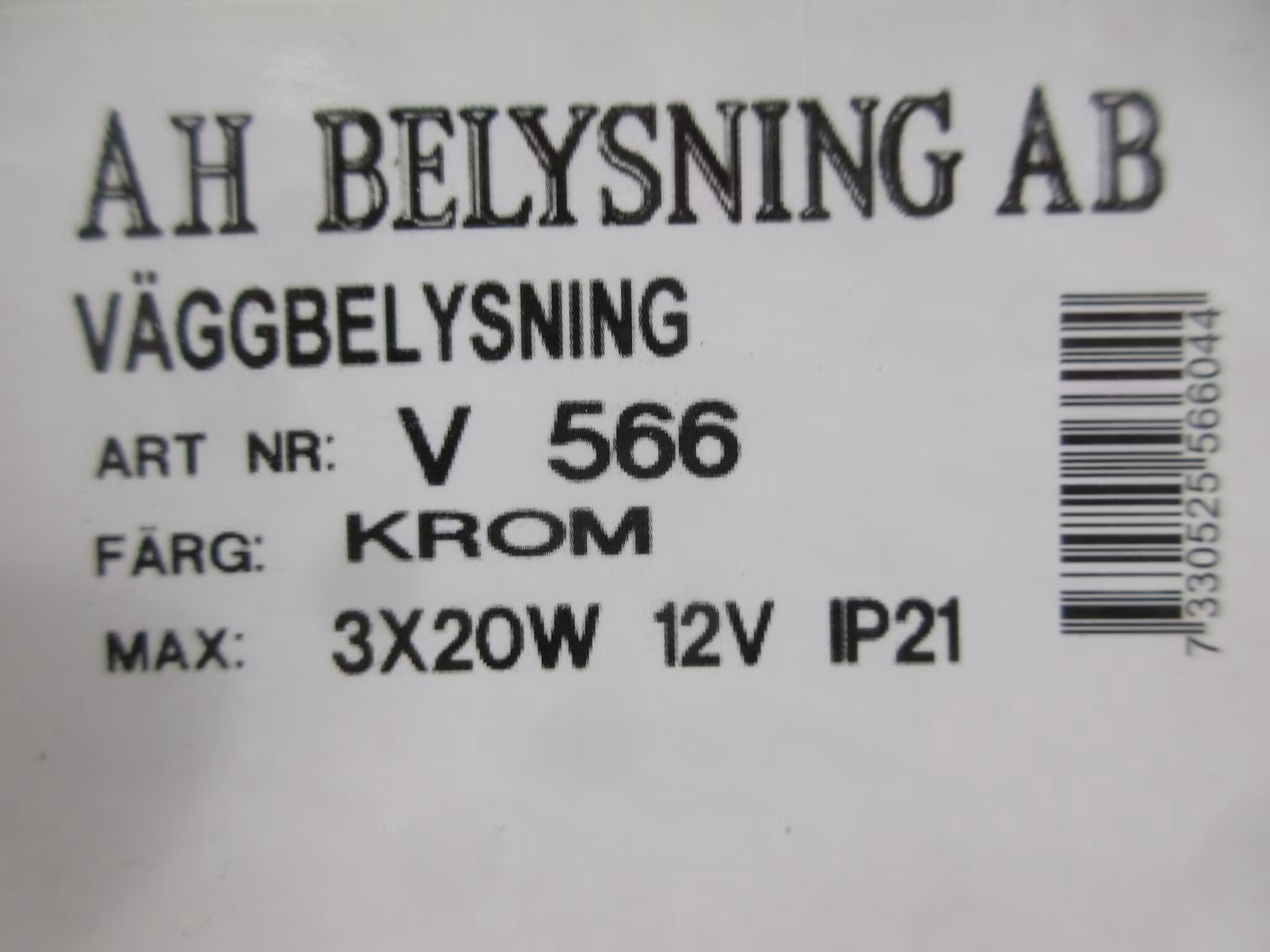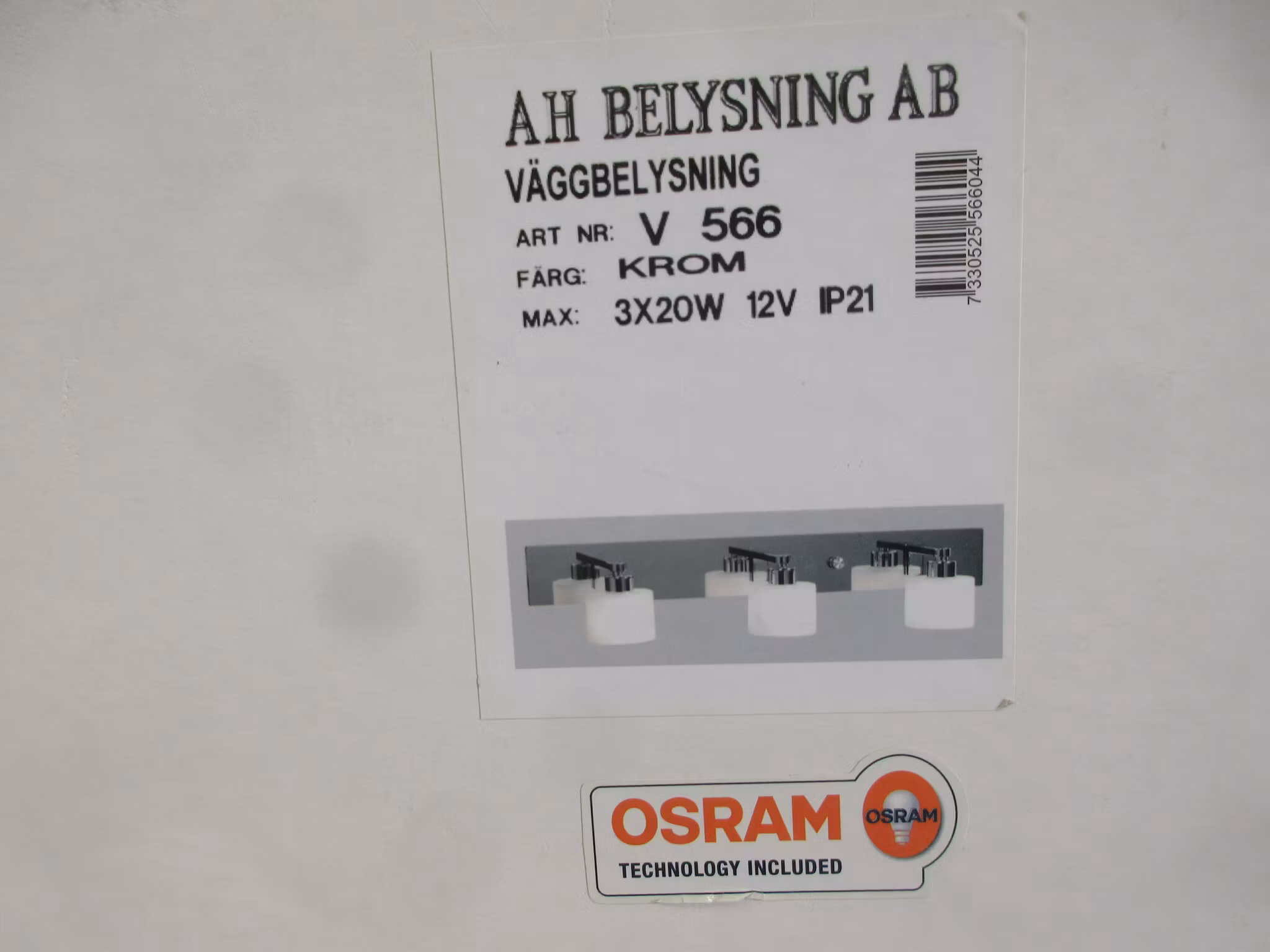 H 12cm B 58cm 3x20w 12v IP21. Väggavstånd 17 cm. Dimmer JA.