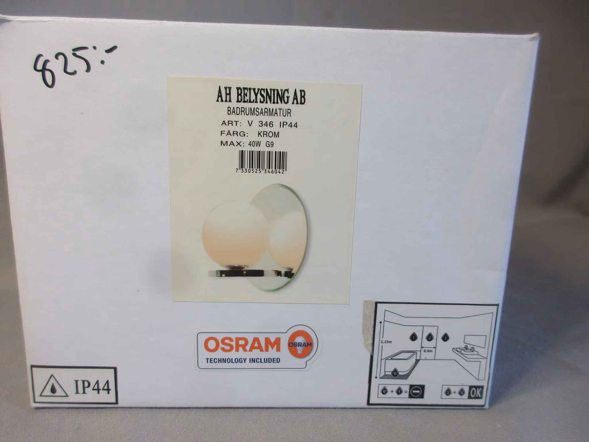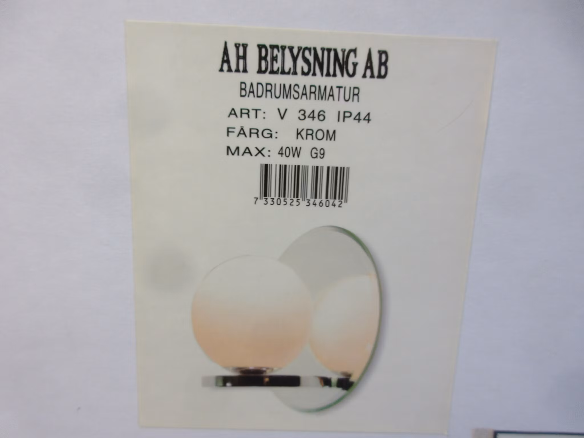 AH Belysning Badrumsarmatur V 346 IP44Art: V 346Färg KromMax 40W G9AB Armaturhantverk, tidigare känt som AH Belysning,EAN 7330525346042