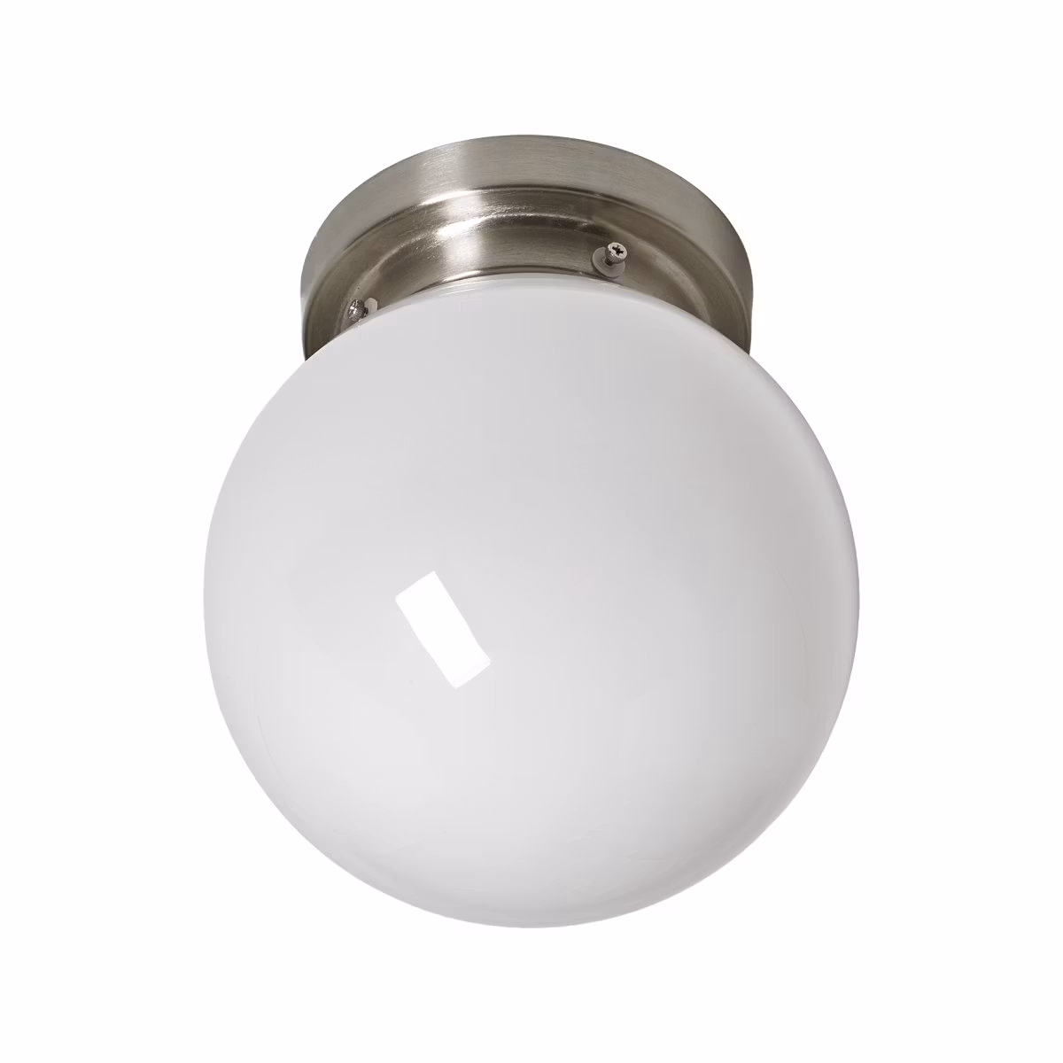 Denna klassiska badrumsplafond med en rund, vit glaskupa och en stilren metallbas ger ett mjukt och behagligt ljus som skapar en avslappnande atmosfär i ditt badrum. Lampans tidlösa design passar in i både moderna och traditionella badrum. Med sin IP21-klassning är den säker för våtrumsmiljöer och fungerar perfekt som huvudbelysning eller komplementbelysning. Ett elegant val för att förhöja ditt badrums stil och funktion.