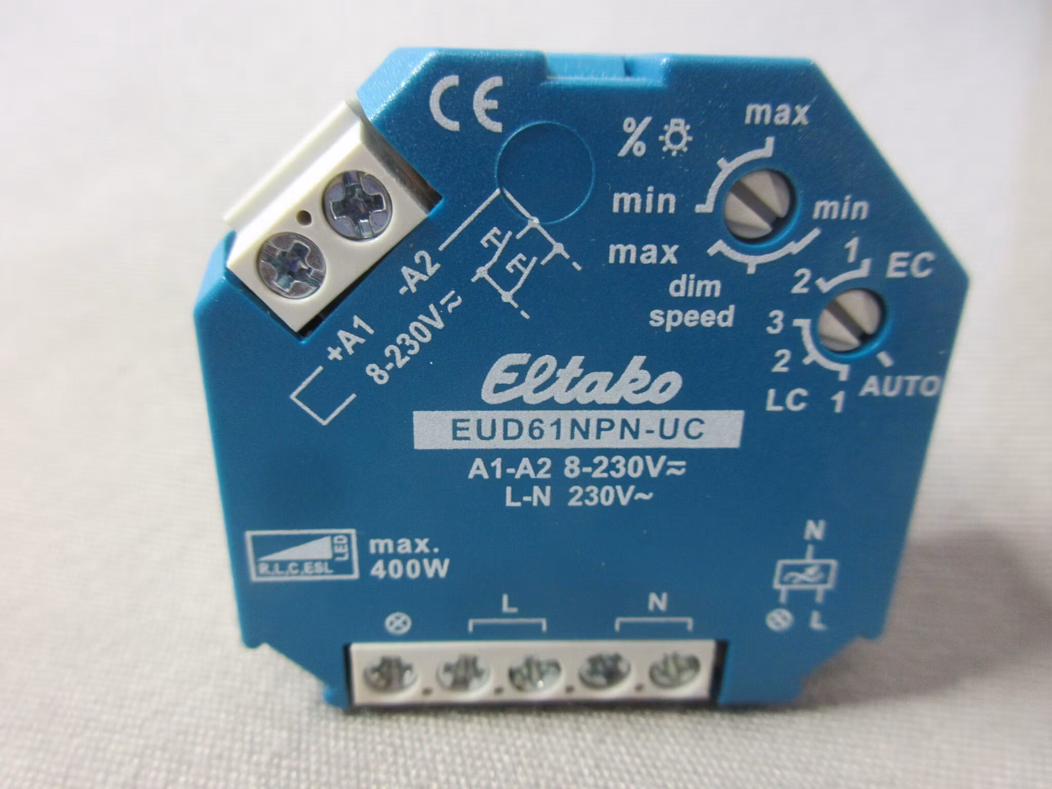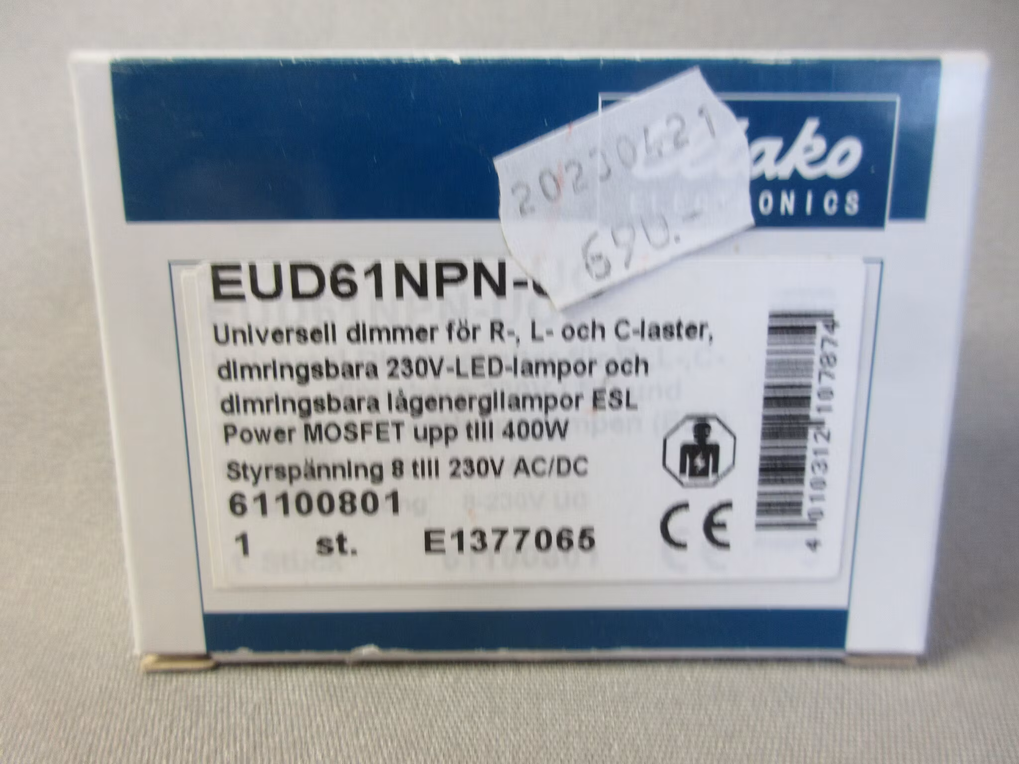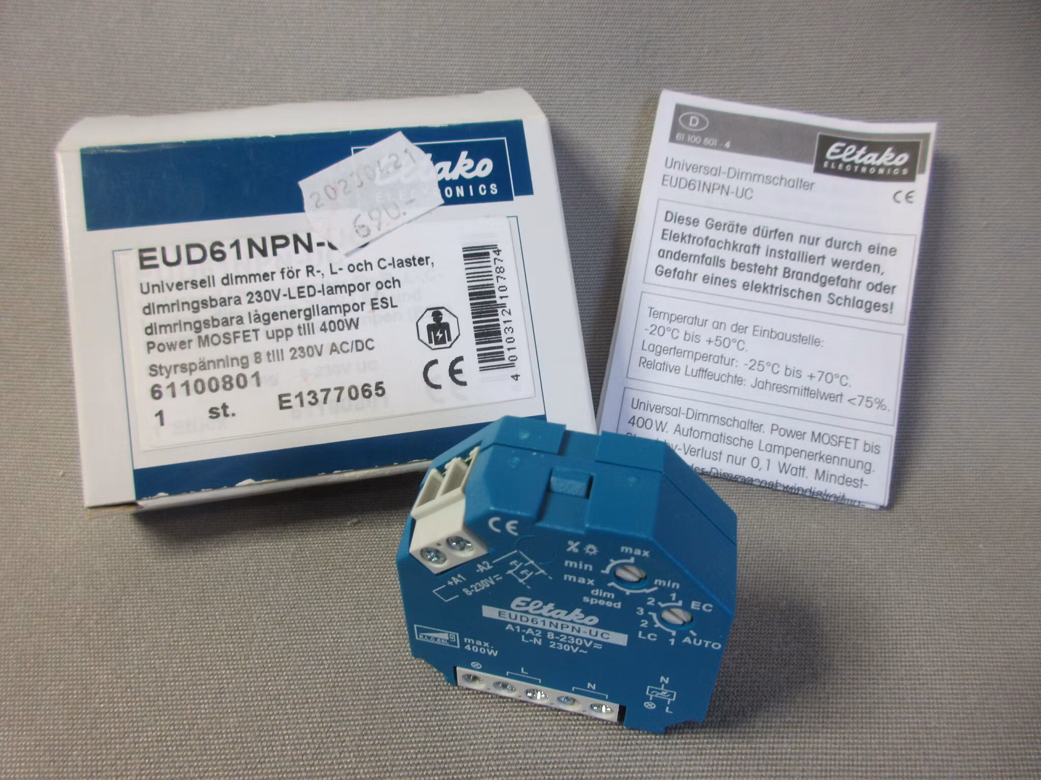Eltako EUD61NPN-UC är en Universell dimmer. Power MOSFET upp till 400 W. Automatisk avkänning av last. "Standby" förbrukning endast 0,1 watt. Lägsta ljusnivå eller dimningshastighet kan ställas in. Med barnkammar- och insomningsfunktion.