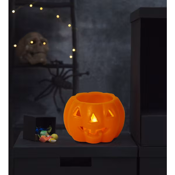 Häftigt vaxljus i pumpa-form. Ljuset är 6.5 cm högt och kommer med batteri inkluderat. Perfekt att placera på bordet eller golvet inomhus för den rätta halloween-känslan!