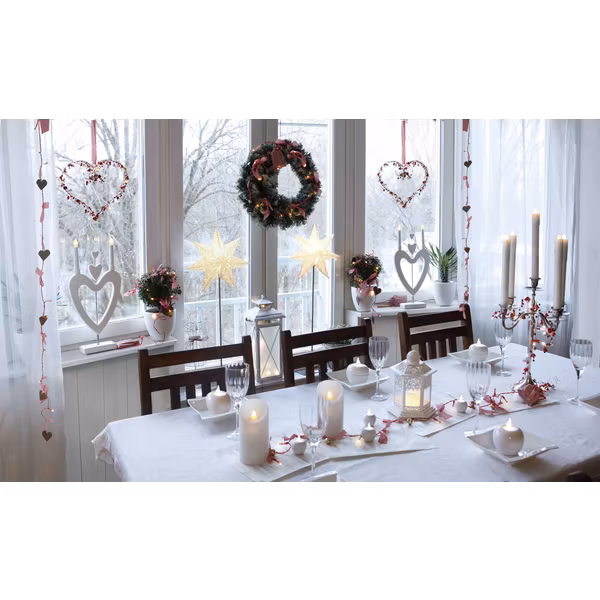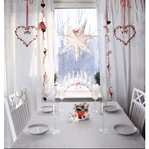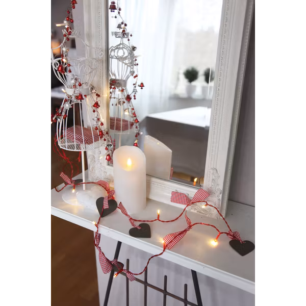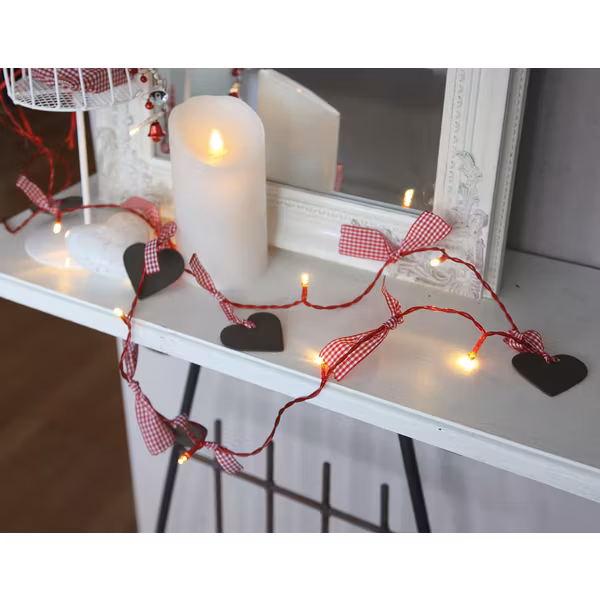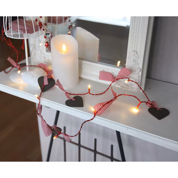 Batteridriven ljusslinga med många dekorationsmöjligheter i hemmet. Ljusslingan är röd och dekorerad med hjärtan. Slingan har en längd på 135cm med 10 varmvita LED-lampor. Den inbyggda timern gör det lätt att ställa in när ljusslingan ska lysa.
