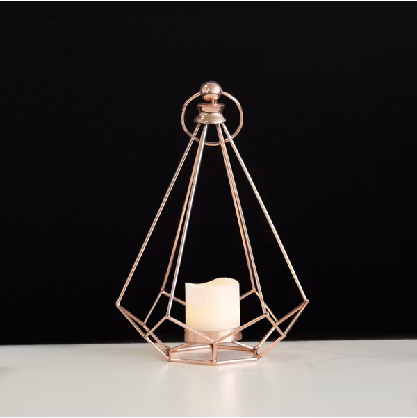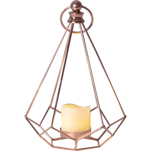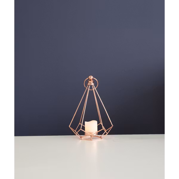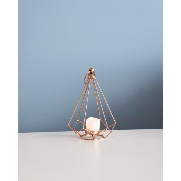 Elegant lykta i kopparfärg med en höjd på 24cm. Placeras fint på ett bord och i en hylla som en modern och snygg inredning. Den inbyggda timern gör det lätt att ställa in när lyktan ska lysa.