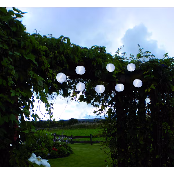 Solcellsdriven ljusslinga fint dekorerad med multifärgade risbollar. Ljusslingan har 10 kallvita LED-ljuskällor. Slingan innehåller ett uppladningsbart batteri som laddas i solen. Batterislingan kan då användas under kväll eller natt. Separat panel som gör att det går att placera slingan i skuggan och panelen på soligt ställe. Kabellängd 200cm.
