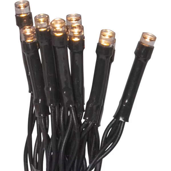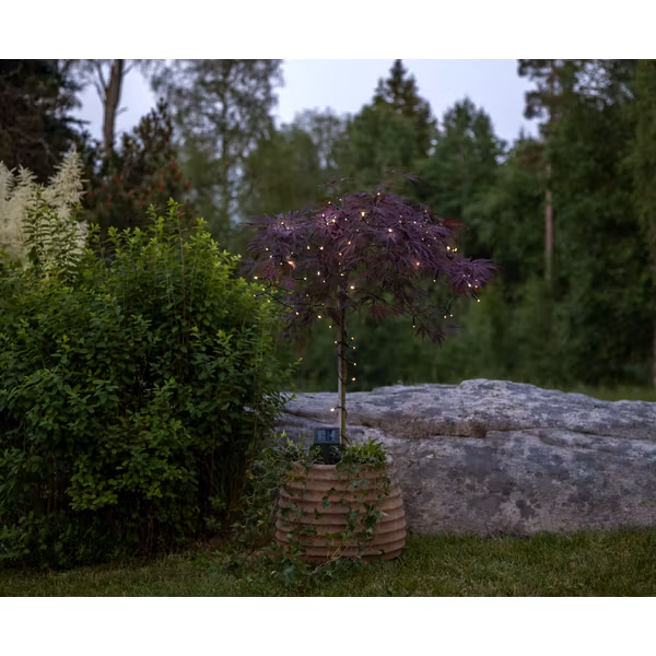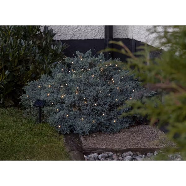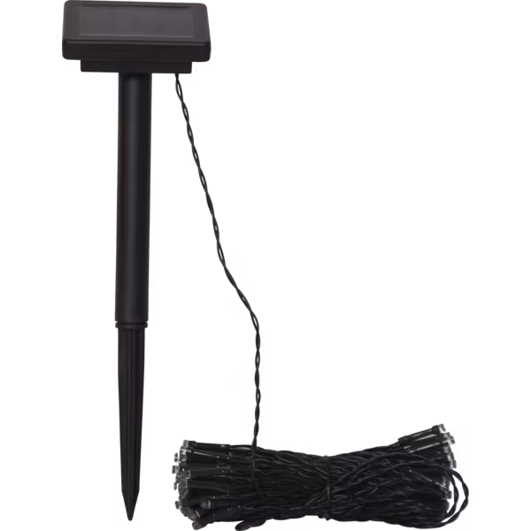 Solcellsslinga med 40 varmvita ljuspunkter. Slingans separata panel har ett uppladdningsbart batteri som laddas av solljus. Batterislingan placeras i skuggan och panelen på soligt ställe..