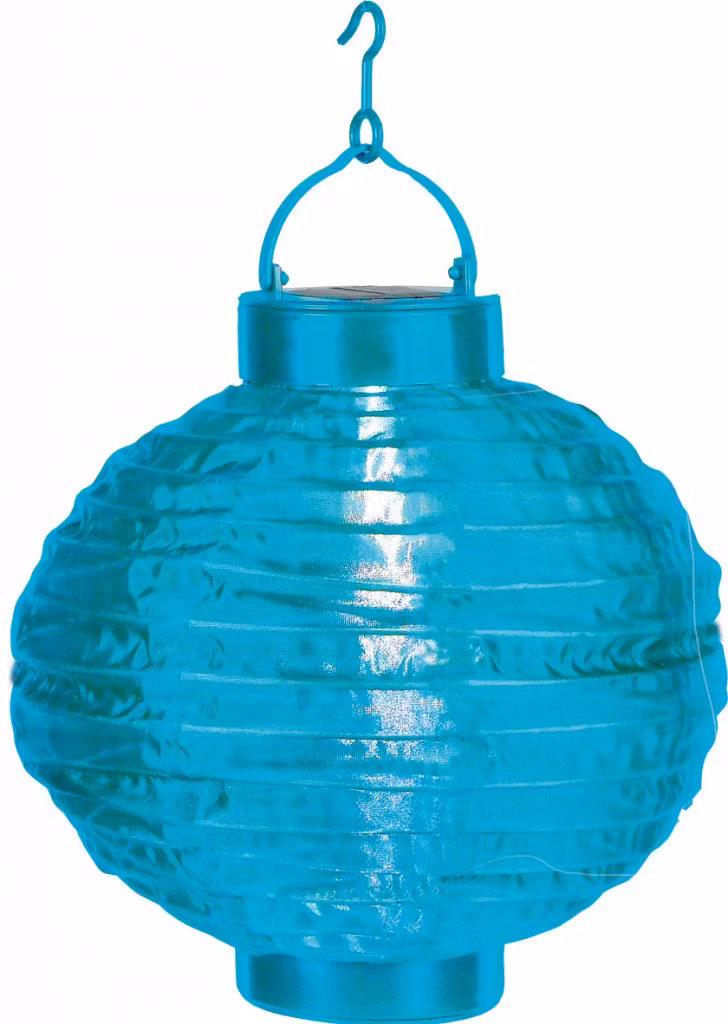 Blå papperslykta som drivs av solenergi. Enkelt, praktiskt och miljövänligt sätt att dekorera med i trädgården. Perfekt dekoration att hänga upp till sommarpartyt och till vardags.