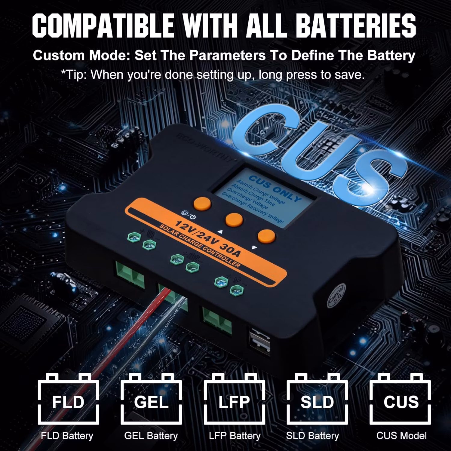 CUS-läge: Laddningsregulatorn har flera fördefinierade batteriregler och anpassningsbara batterinivåer för att bättre uppfylla de faktiska laddningskraven; när inställningarna är slutförda, tryck länge för att spara dem