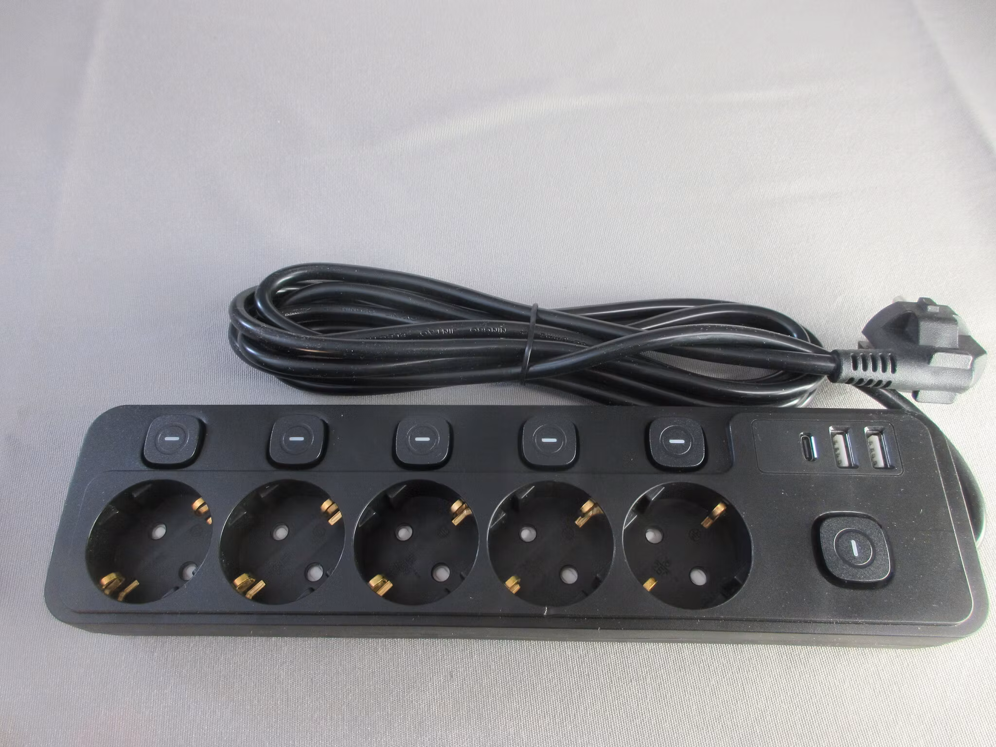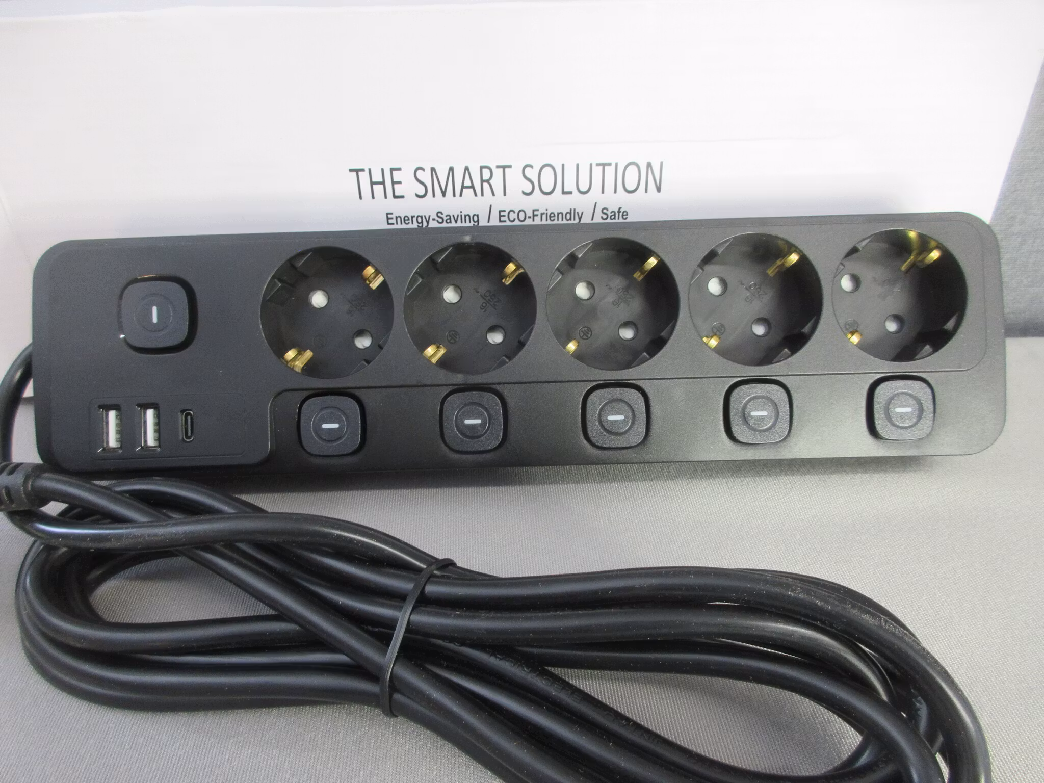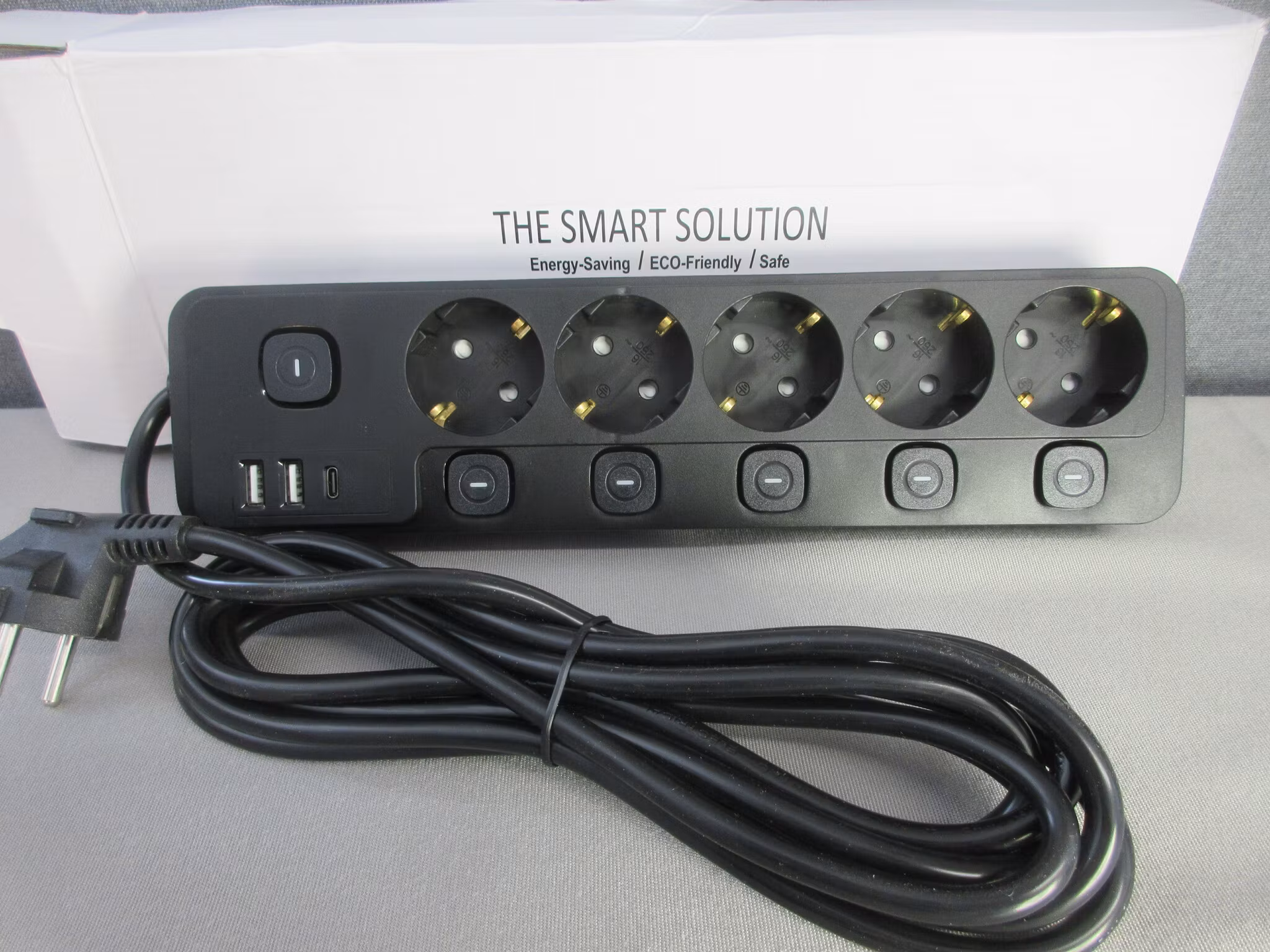 Flera uttag med Individuella Strömbrytare. Den har 5 uttag med en egen strömbrytare som gör att varje enhet kan slås på och av individuellt. Detta sparar el och undviker onödig vänteläge