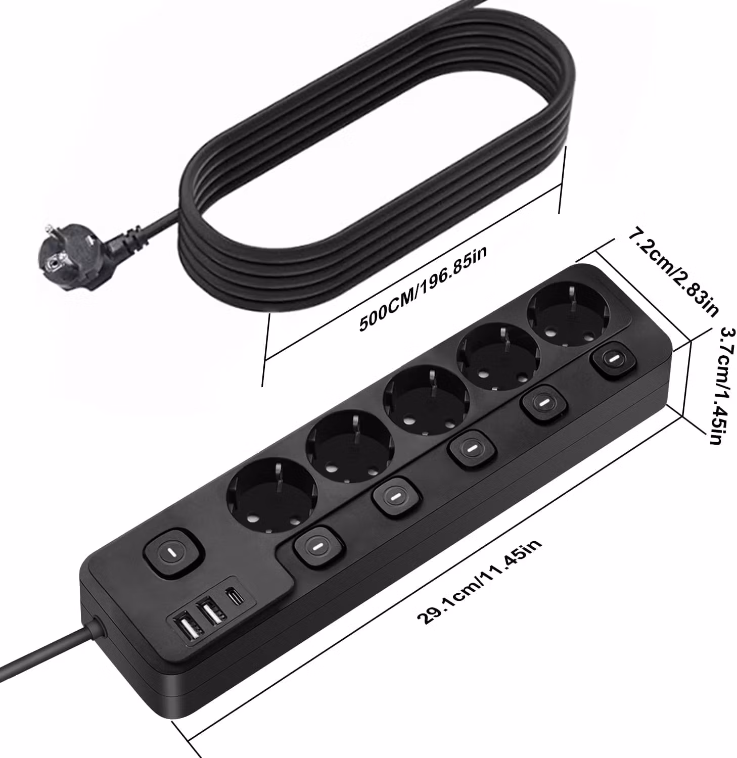 Grenuttag med Individuella Strömbrytare, 5m kabel, 5-vägs multipeluttag med 2 USB-A och 1 USB C, Flera Uttag Strömlist Överspänningsskydd för hemmakontor, svart.