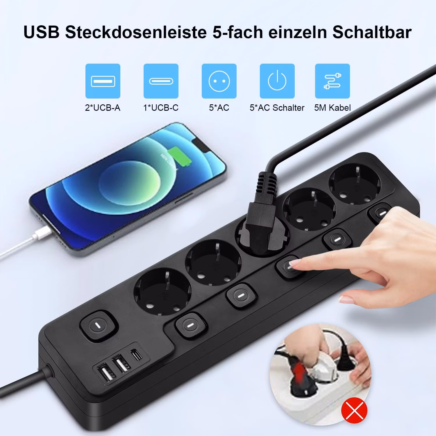 5-vägs Grenuttag med USB C. USB-grenuttaget har 5 individuellt omkopplingsbara uttag som är placerade i 45° vinkel, och varje uttag är tillräckligt långt bort från varandra, att även breda kontaktnätaggregat kan placeras bredvid varandra, 5 enheter kan anslutas samtidigt, det är en idealisk lösning för hem, kontor etc