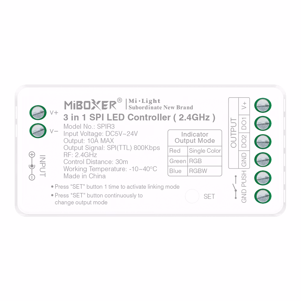 SPIR3 controller is designed for Pixel led strip with 2.4GHz wireless transmission technology, have high speed transmitting and strong ability for anti-interference, stable signal Working with C6 or B6 remote, adjust mode, color, brightness, ON/OFF time and editing dynamic lighting feature