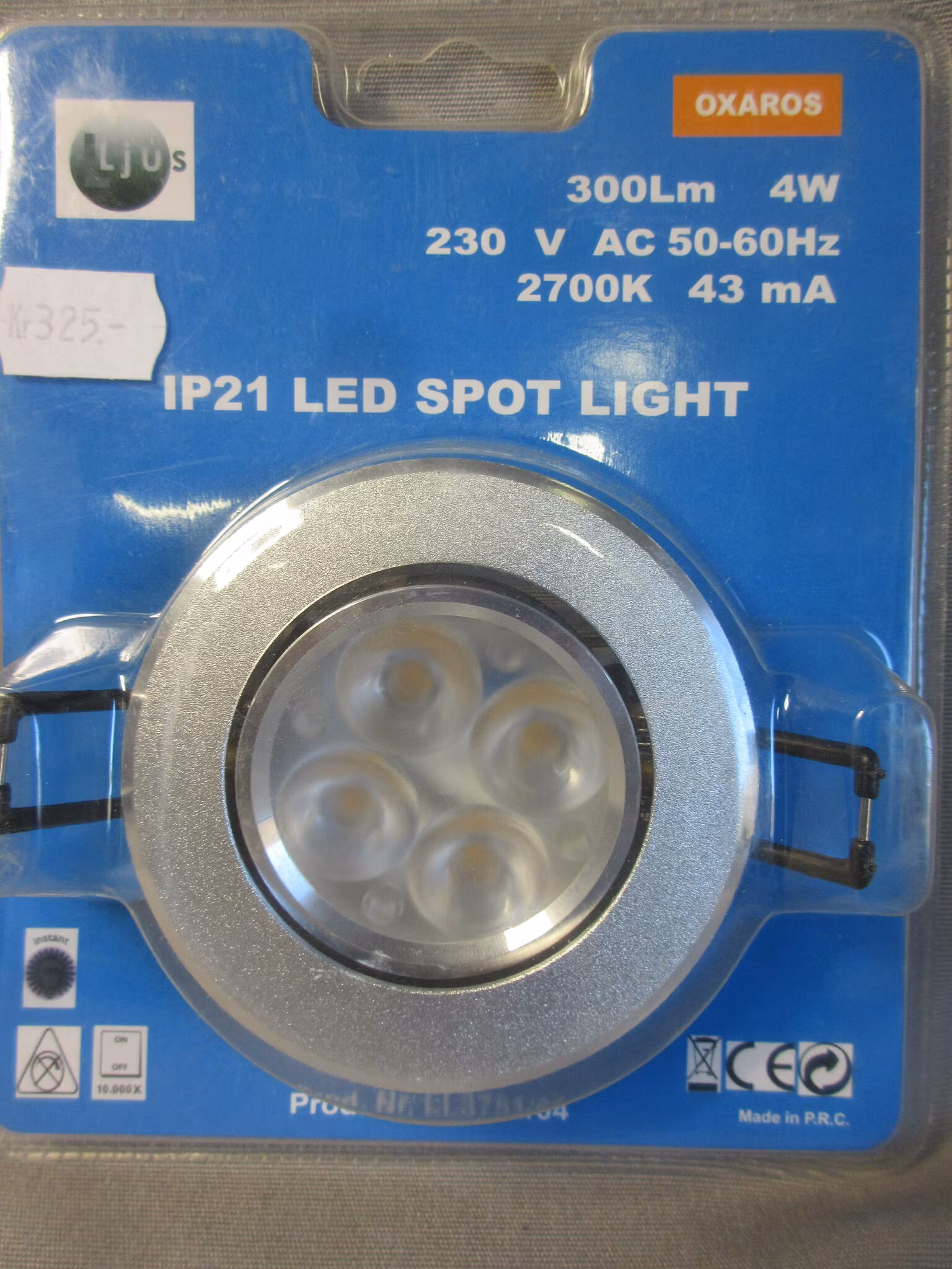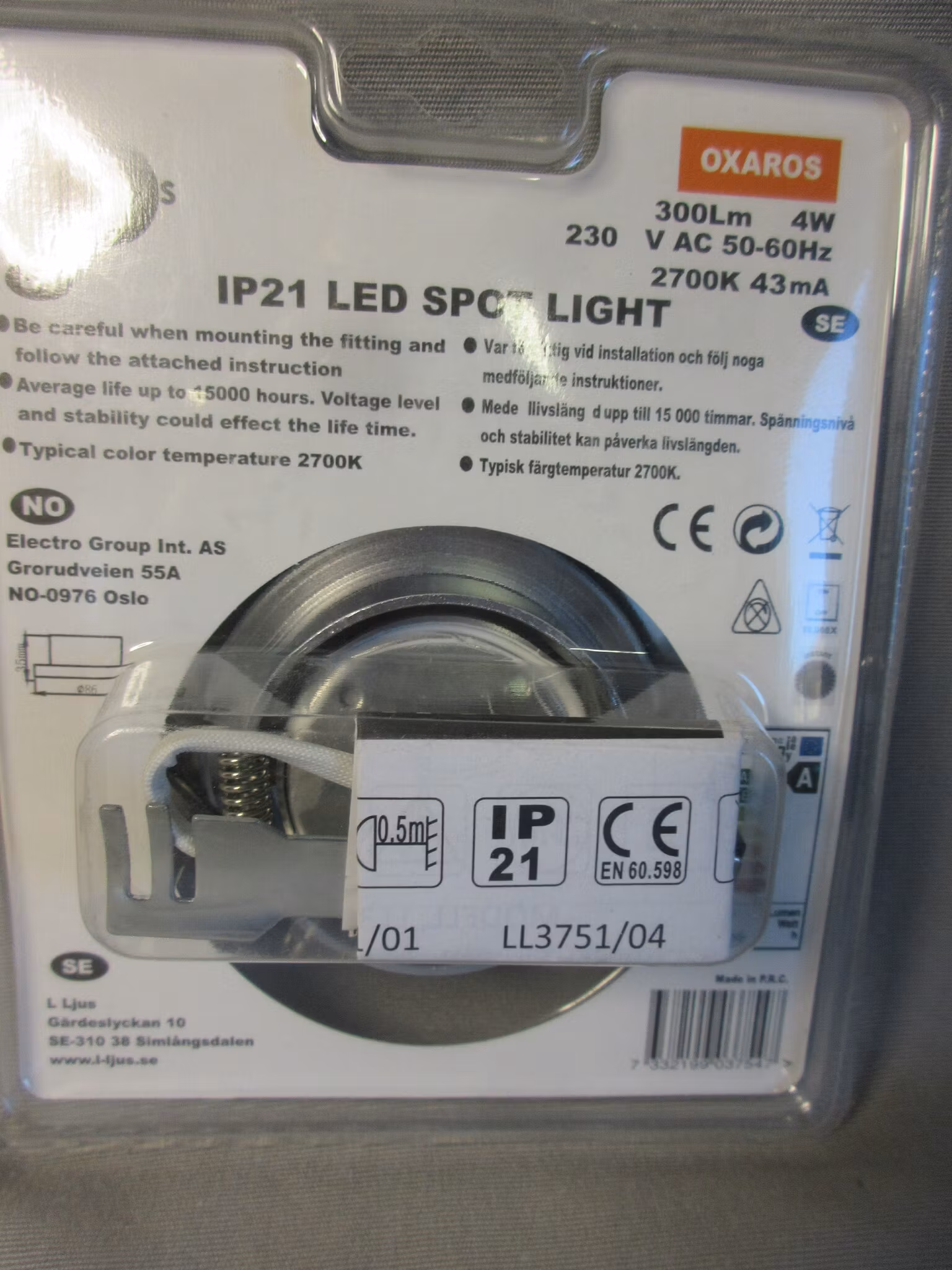 OXAROS Spot Light LED 4W IP21. Silver300Lm4W230 V AC50-60Hz2700K43mA15000hProd. Nr LL3751/04EAN 7332199037547