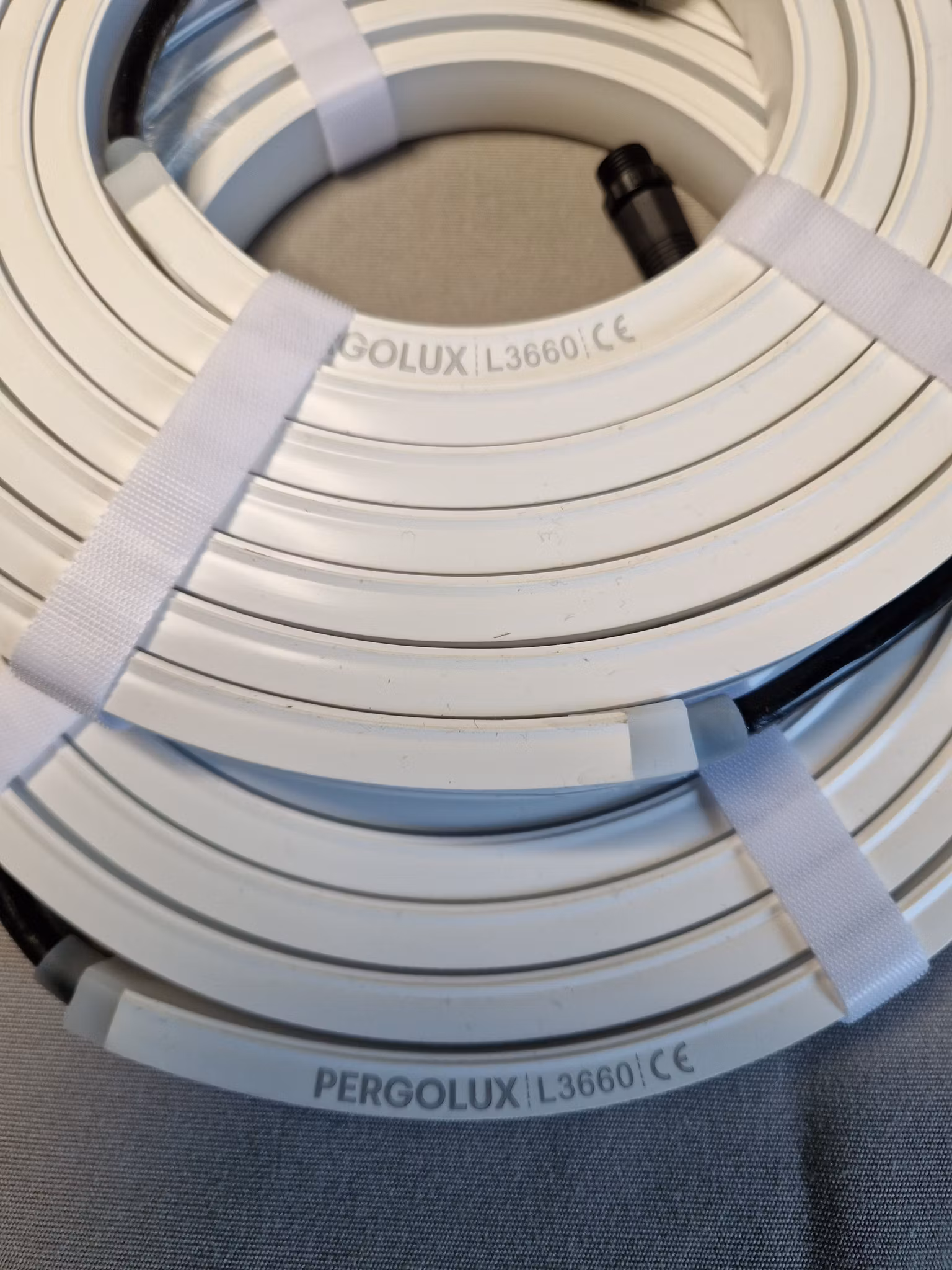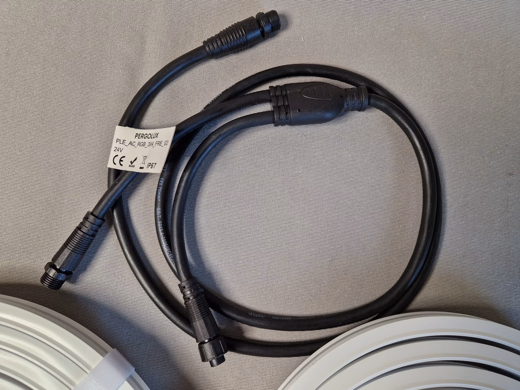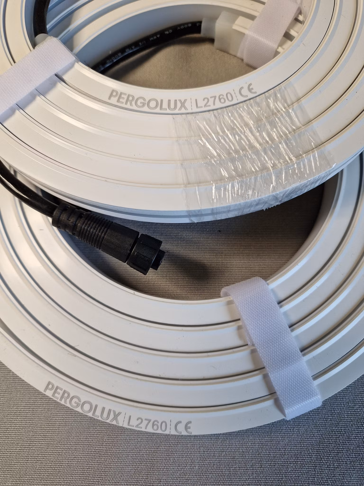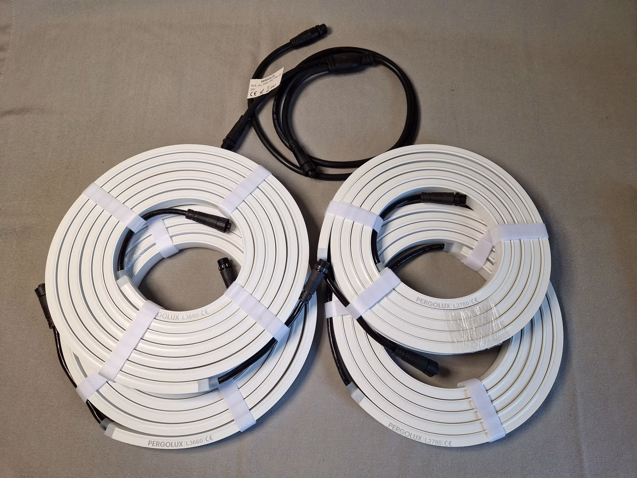PERGOLUX LED-ljus Extra kit RGB.Splitt och 4 ljuskablar troligen för 3x4 m pergola.2x Längd 3660 cm2x Längd 2760 cmSe bilder för info om exakt vad som följer me