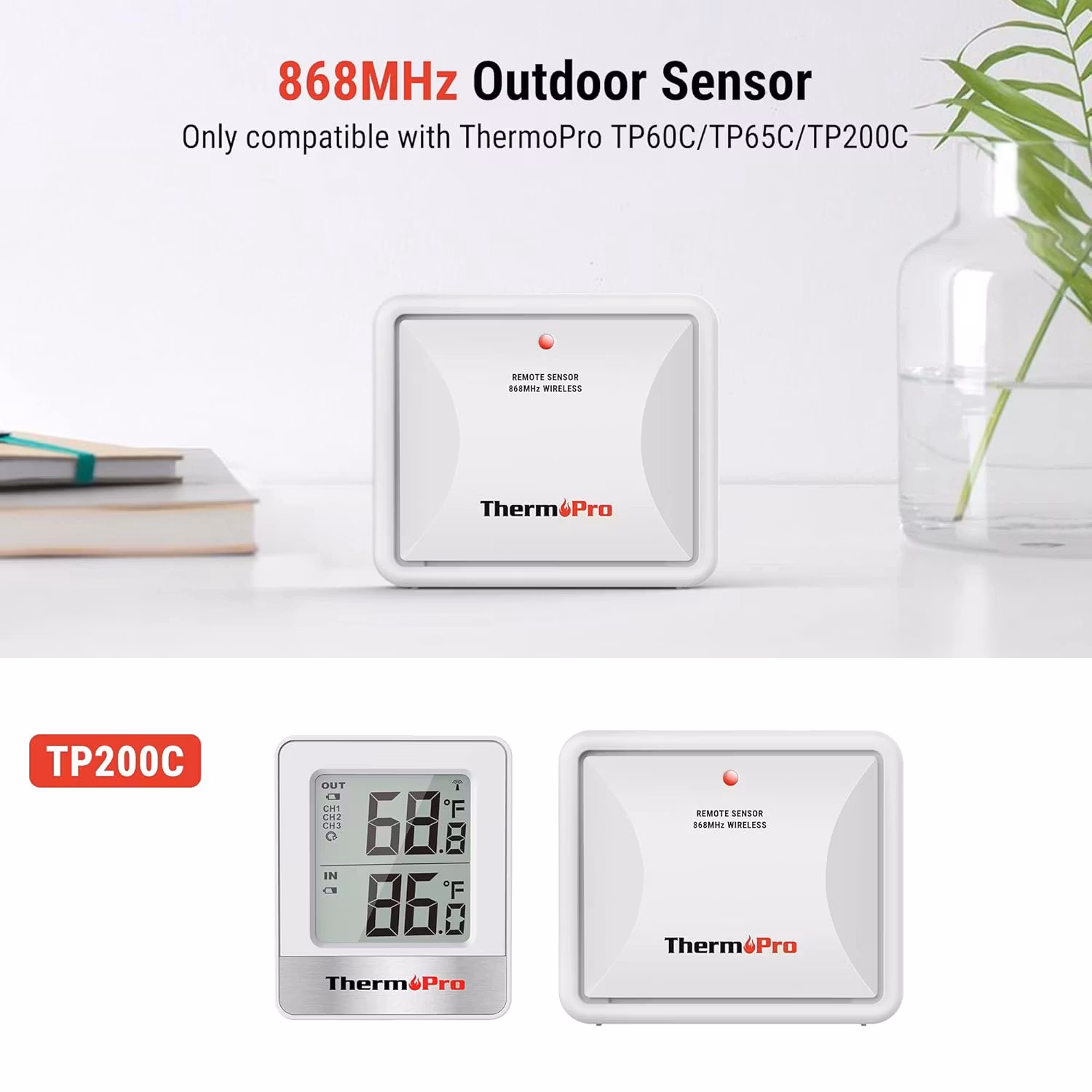 Förlängning eller ersättning för ThermoPro TP200C (ASIN: B09XQT2TVS), TP60C (ASIN: B07G2YM494), TP65C (B075VMLZB9). Observera: Om produkten du köpt är en gammal modell av ThermoPro inomhus och utomhus temperatur- och fuktighetsmätare (förpackningslådan markerar modellen omedelbart som: TP-60S, TP-65, TP-65S etc.), köp rätt ASIN fjärrsensor: B0711T22R6 . Att köpa fel fjärrsensor kan göra din enhet inte funktionell.