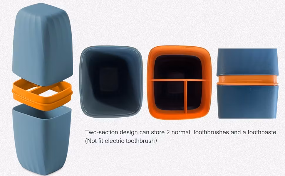 Bärbar design: Speciell tandborsthållare för resor, detta tandborstfodral har två sektioner, håll dina tandborstar rena; Runda hörndesign, kommer inte att repa din hud eller några föremål i din väska. Den är sammankopplad med en fästring och kan separeras som två koppar.