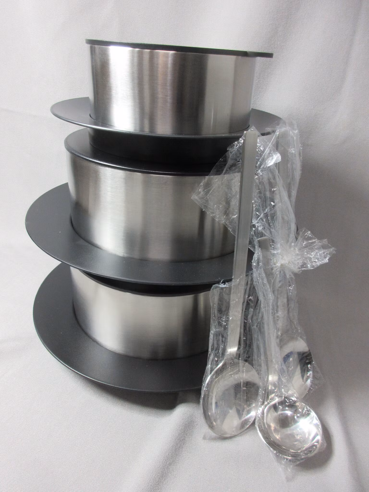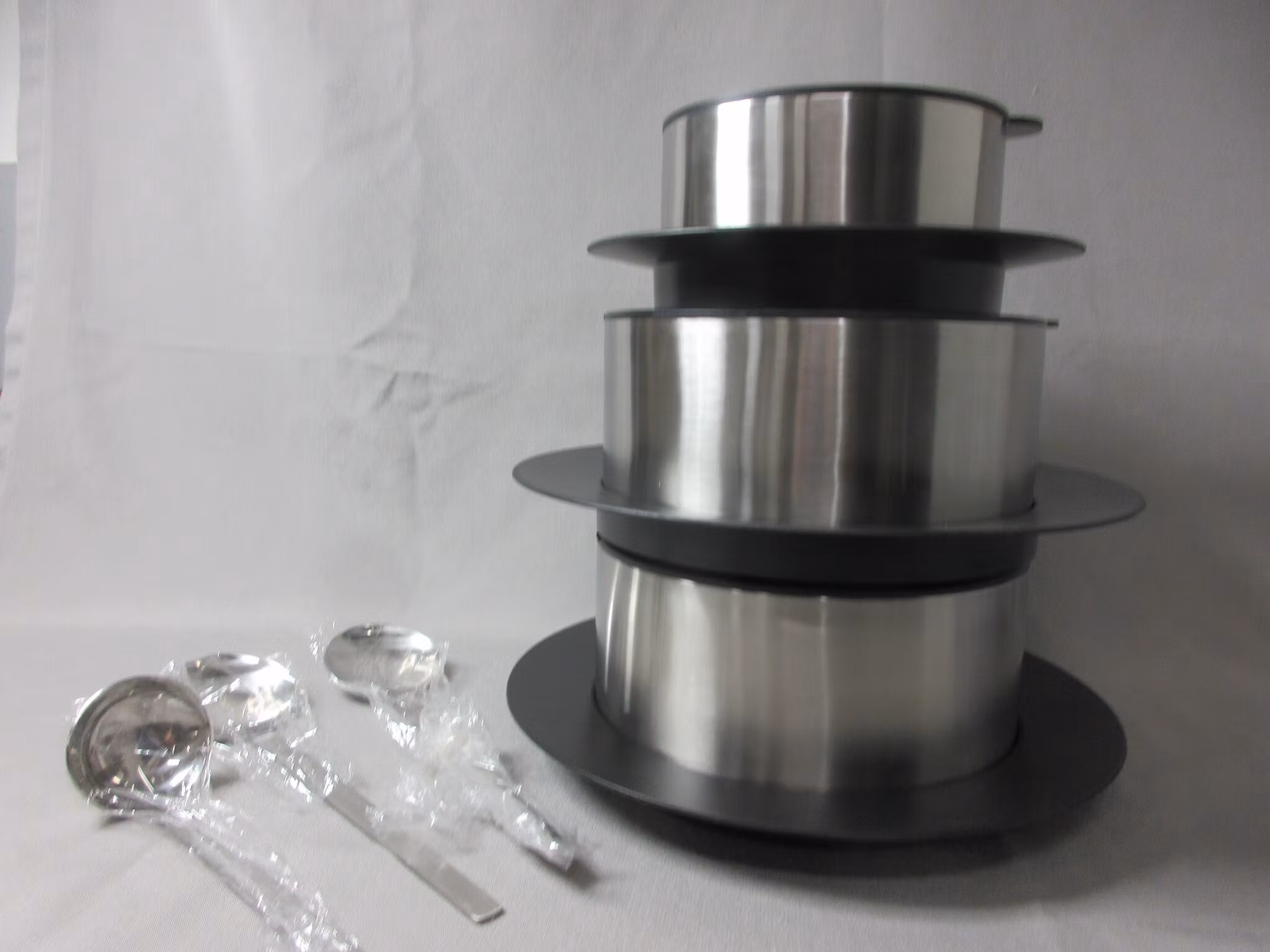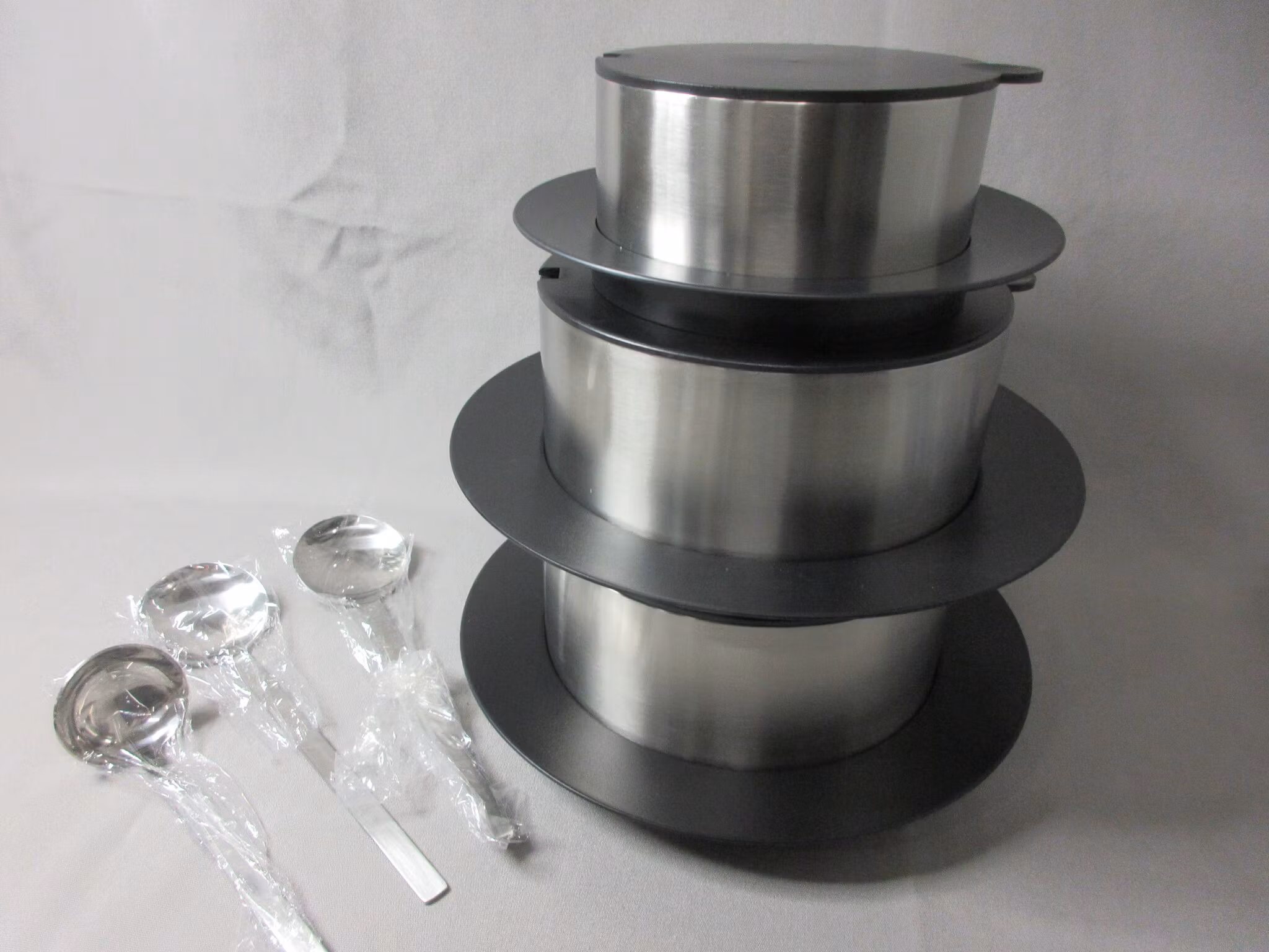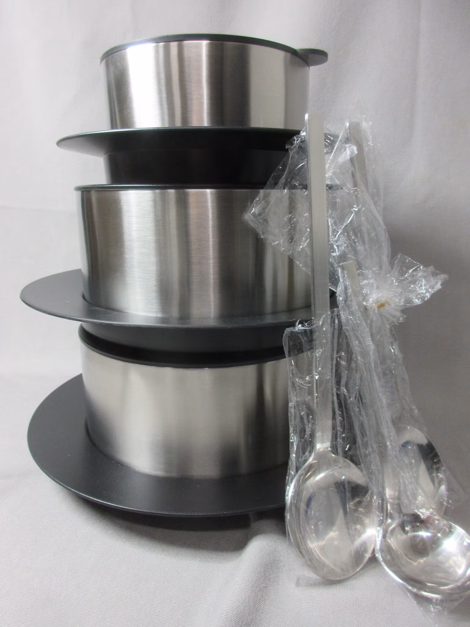 Serveringset Dubbelvägg i den rostfria serveringsskålen för att hålla värmen. Lock, fat och slev medföljer.