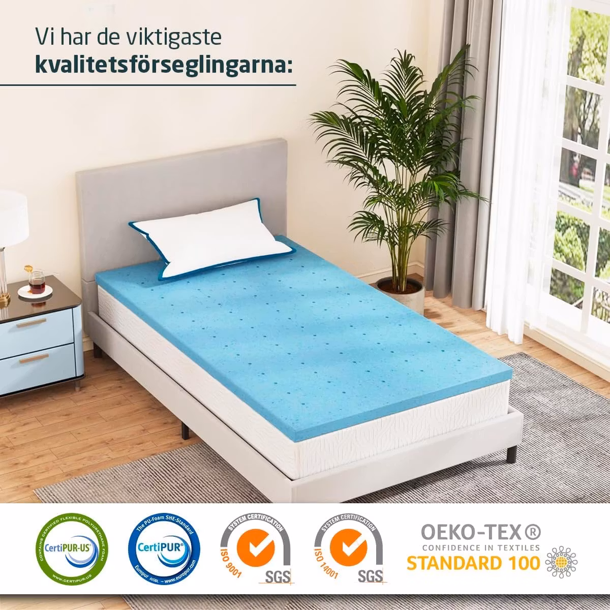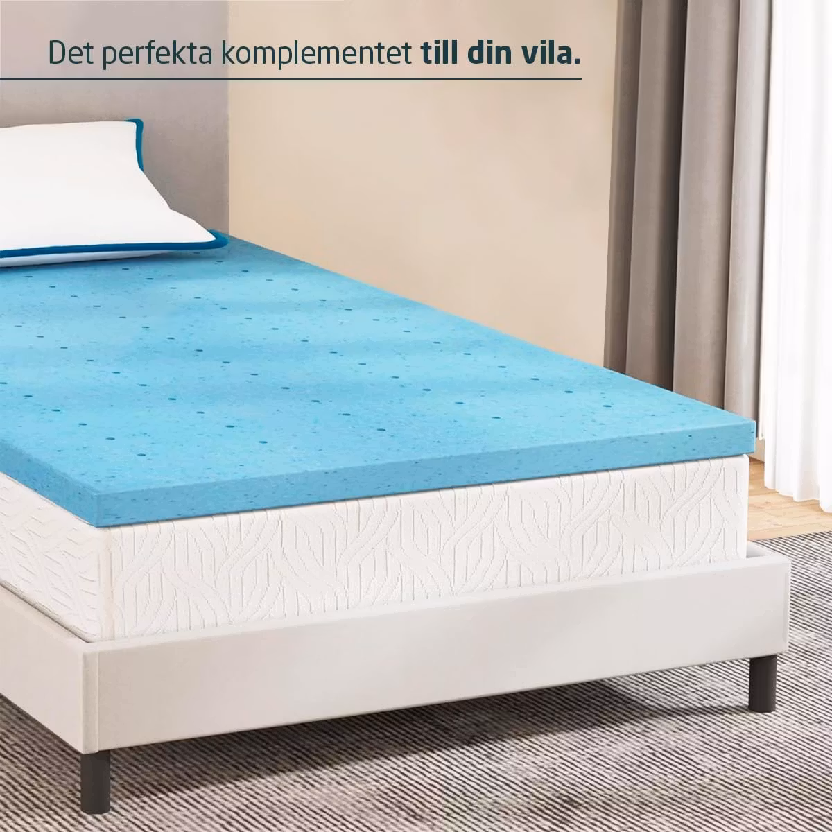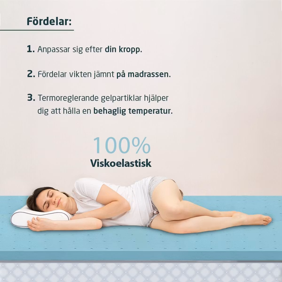 MAXIMAL KOMFORT: Övermadrassen av premium memory foam anpassar sig efter din kropp och fördelar vikten jämnt så att du kan njuta av en lugn, uppfriskande sömn. Termoreglerande gelpartiklar hjälper till att upprätthålla en behaglig temperatur för en sval sovmiljö. Den är gjord med 100 % memoryskum. Den har ett minnessystem med gelpartiklar. Mått: 150x190x5 cm.