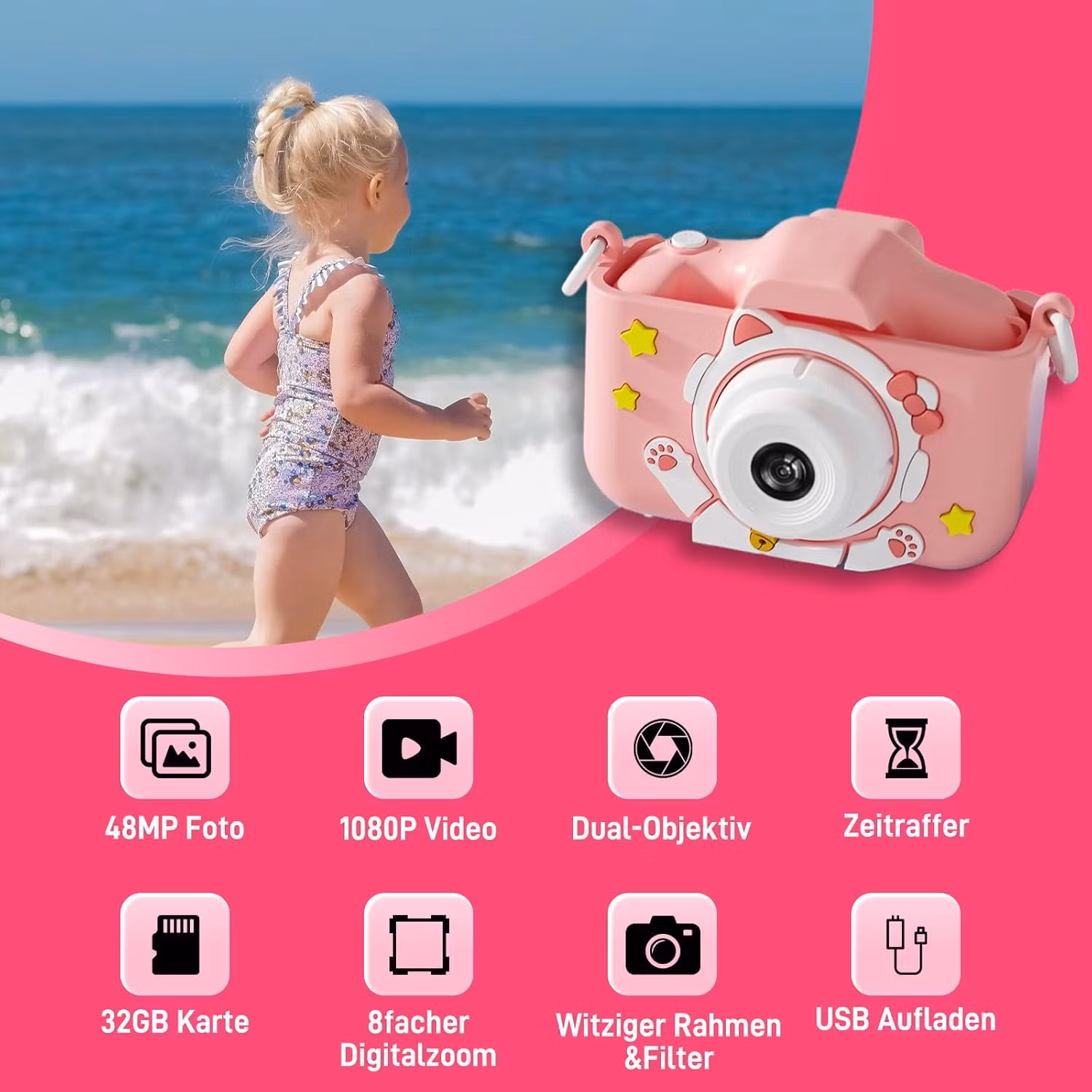 8 MP – Njut av tydliga pixlar: Barnkamera är utrustad med 48 MP dubbla objektiv och 8x zoom, vilket gör att barn kan fånga livets speciella ögonblick. För att skydda din syn är den här barnkameran utrustad med en 1080p HD-skärm. HD-ögonskyddsskärmen skadar inte dina ögon. Vi erbjuder även 32 GB lagringsutrymme så att barn kan fånga och spara ännu fler värdefulla minnen med vår kamera.
