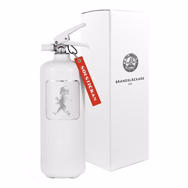 SOLSTICKAN Brandsläckare 2 kg Vit Försäkra dig med en smidig och stilfull pulverbrandsläckare som passar utmärkt för mindre utrymmen och som släcker de flesta mindre typer av bränder. Brandsläckaren har ett aluminium emblem med präglad avbildning av Solstickepojken.